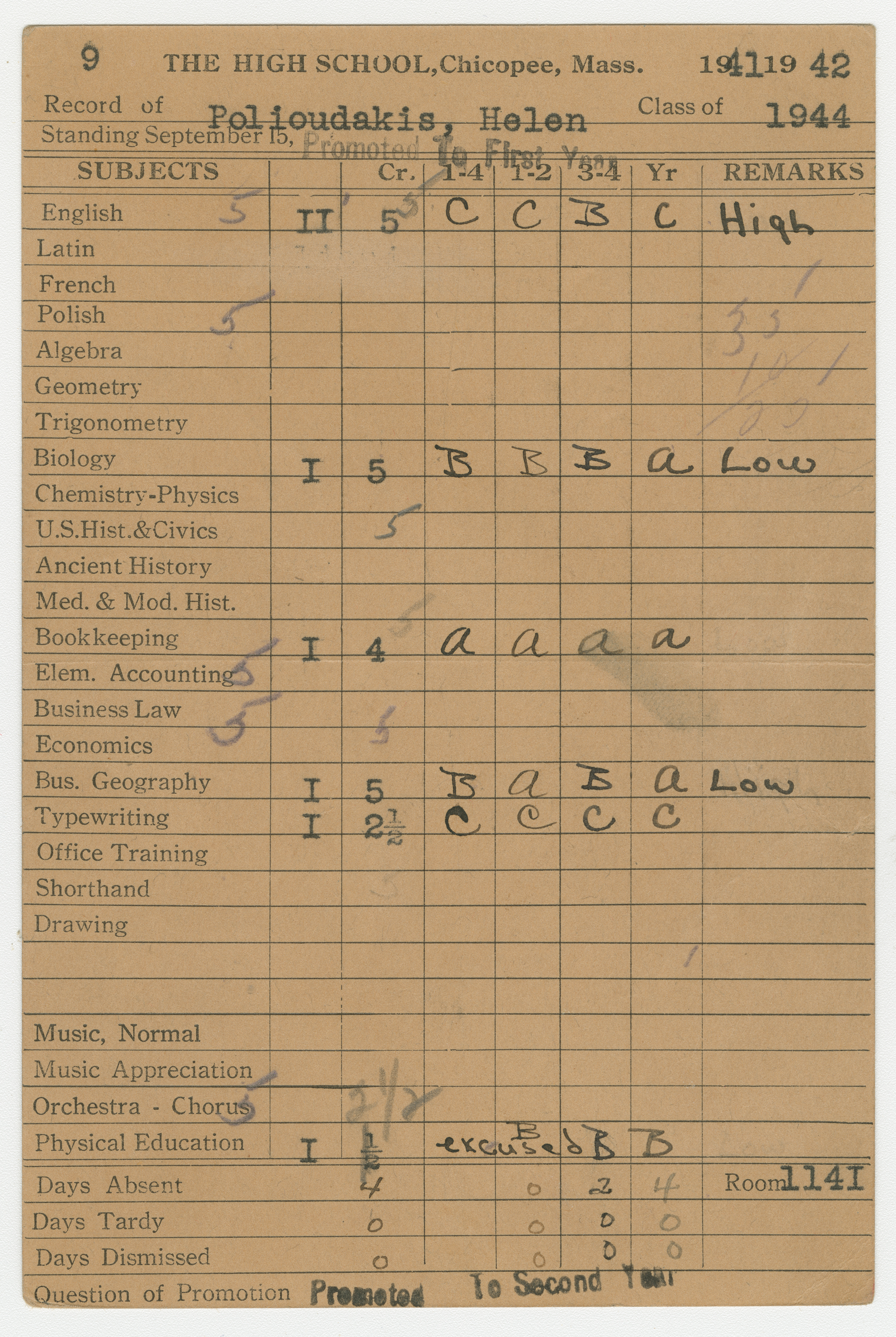 “Chicopee High School Report Card (1941 - 1942) for Helen Polioudakis,” Chicopee Archives Online, accessed April 23, 2026, https://www.chicopeepubliclibrary.org/archives/items/show/9249.