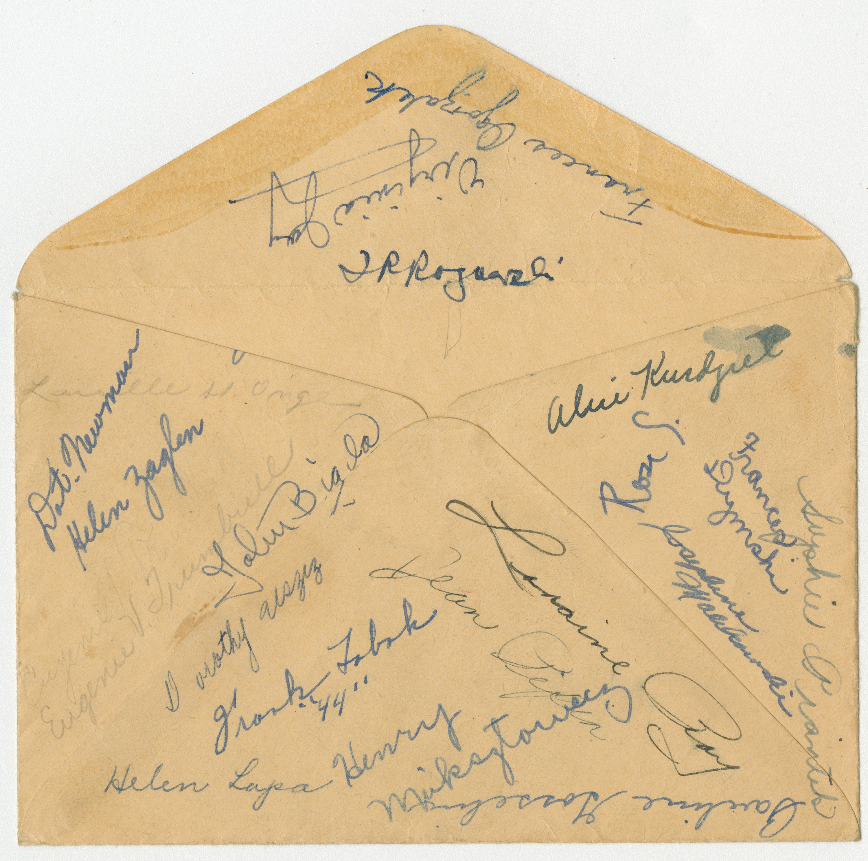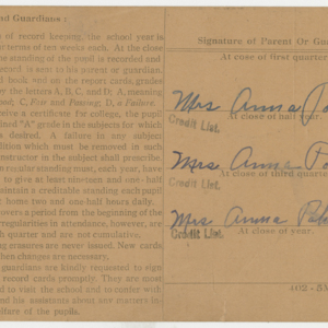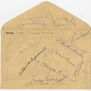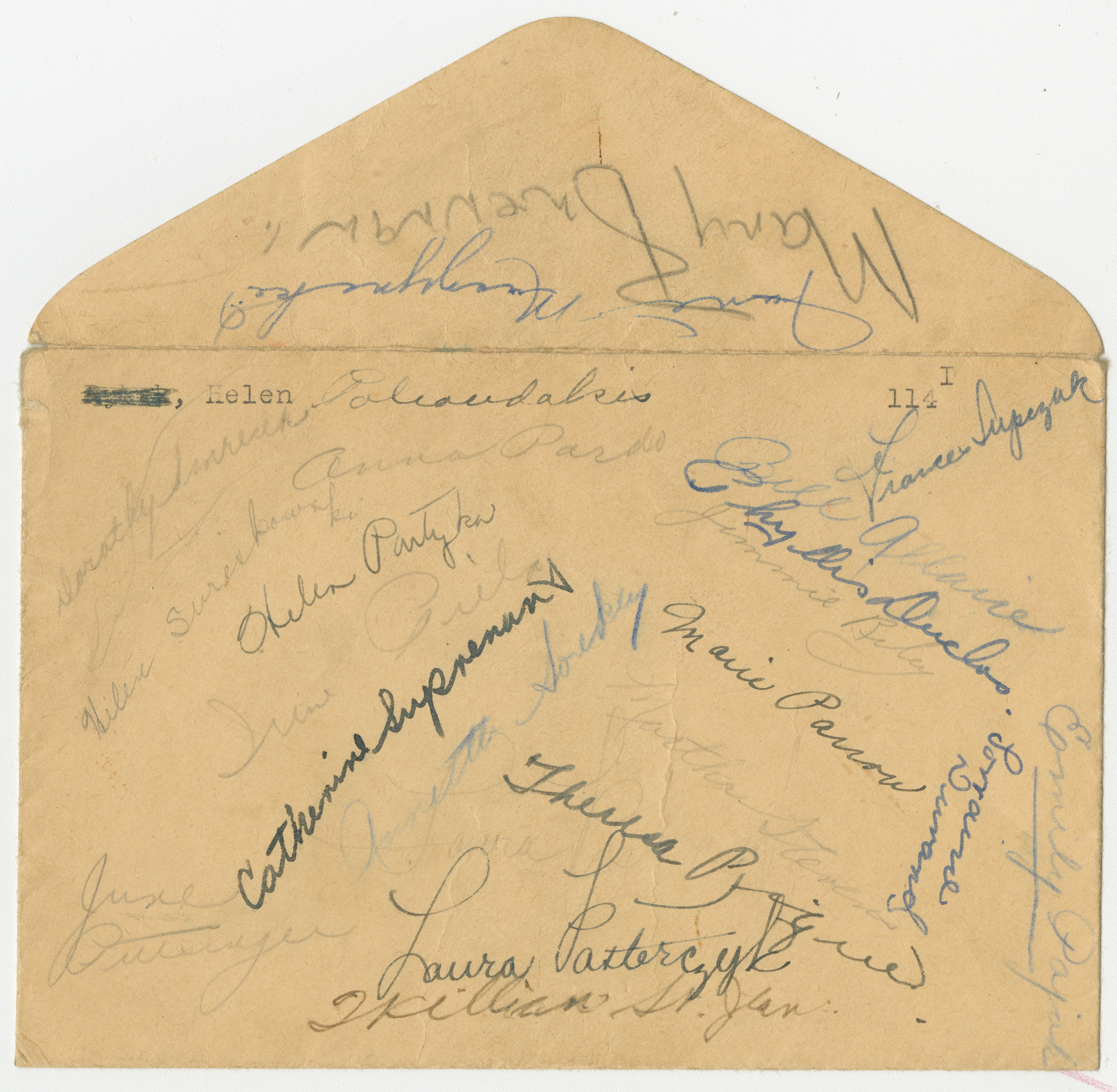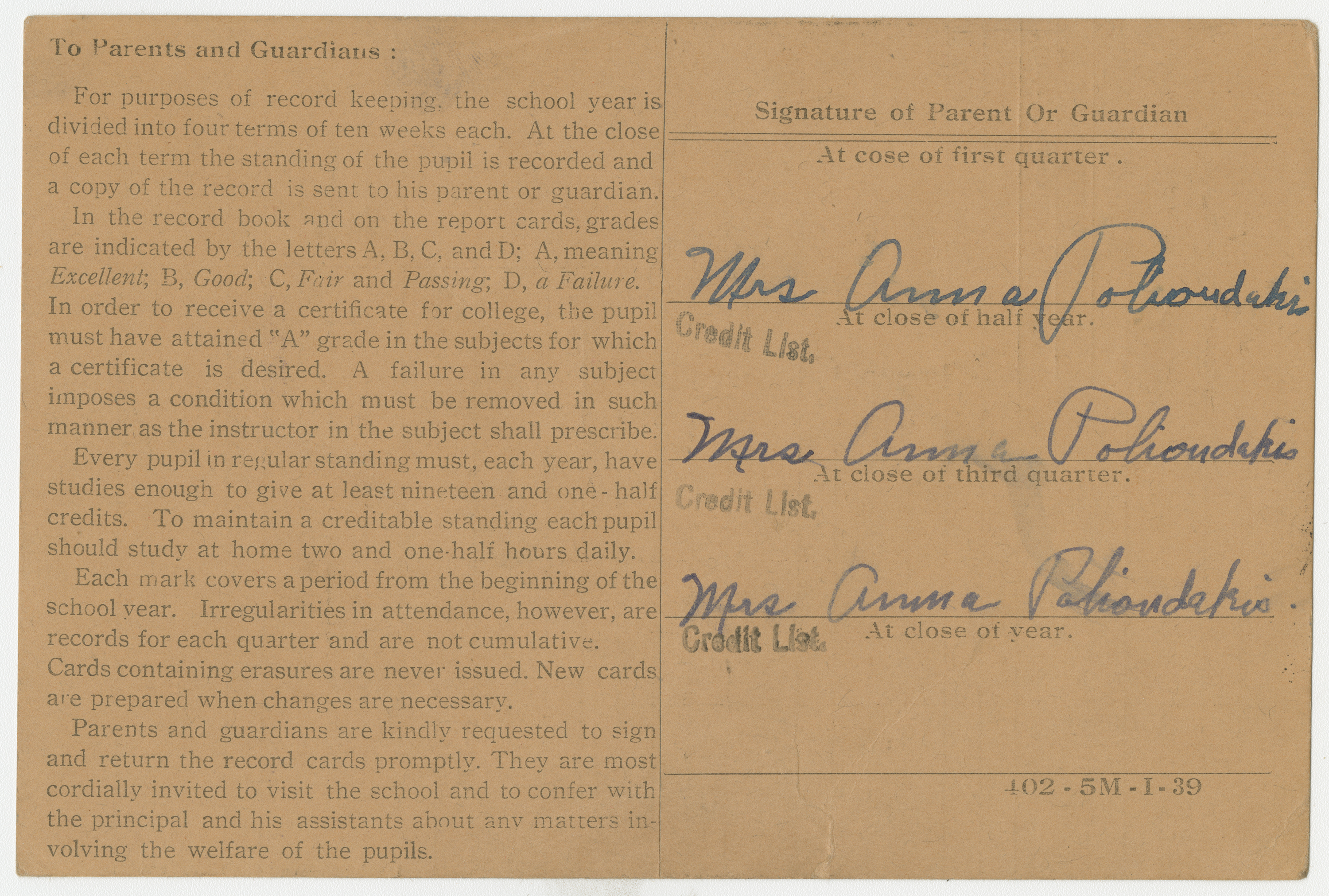 10th Grade Report Card for Helen Polioudakis at Chicopee High School. Grades for 4 terms in the 1941/1942 academic year. Subjects graded include English, Biology, Bookkeeping, Business Geography, Typewriting and Physical Education. Information counts on Days Absent, Tardy and Dismissed also included. On back, Helen's mother's signature is listed three times under Signature of Parent Or Guardian as "Mrs. Anna Polioudakis". Accompanying enveloped with classmate signatures on both sides.