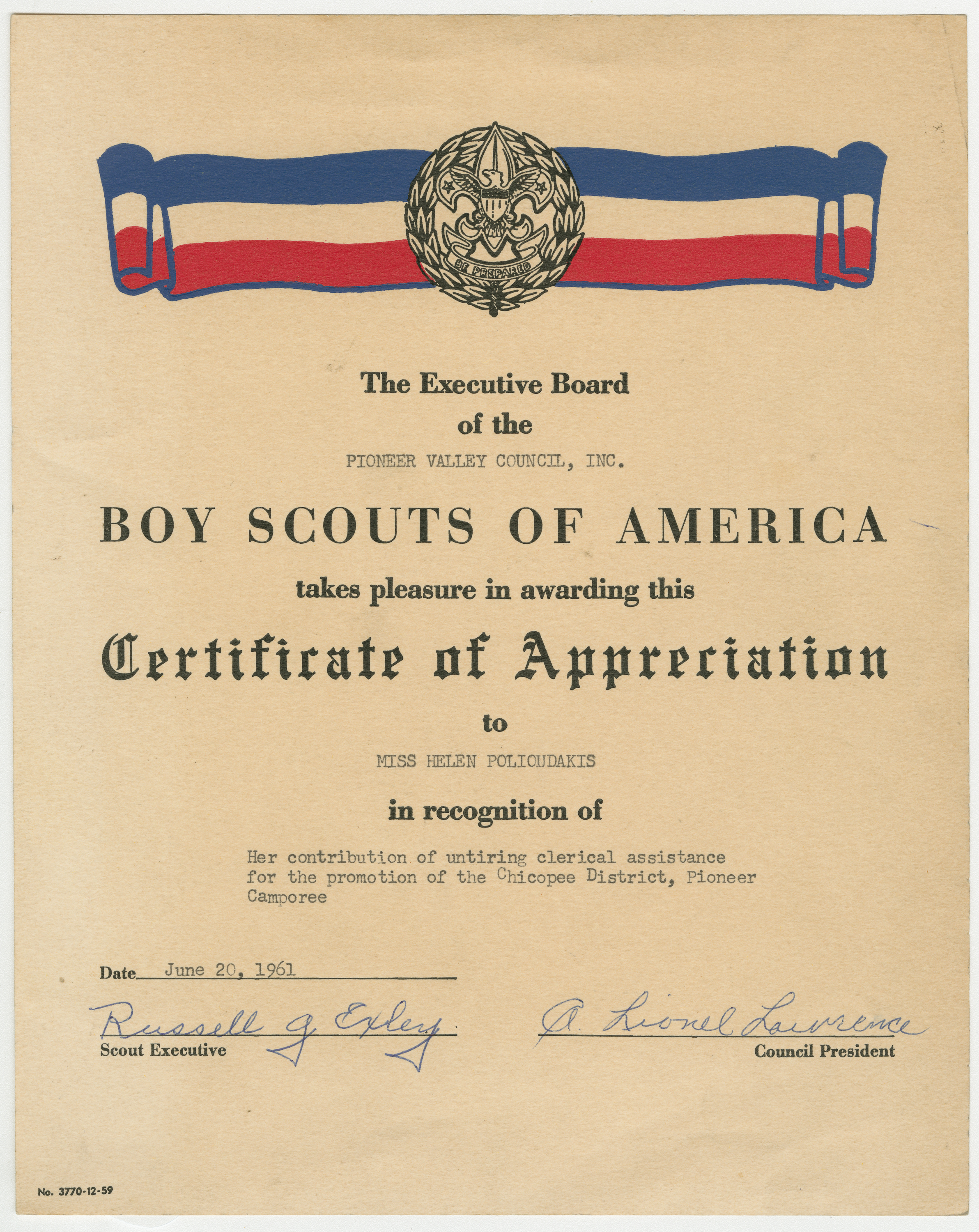 Boy Scouts of America Certificate, dated June 20, 1961, by The Executive Board of the Pioneer Valley Council, Inc. to Miss Helen Polioudakis for "Her contribution of untiring clerical assistance for the promotion of the Chicopee District, Pioneer Camporee". Signed by Russell G. Exley, Scout Director and A. Lionel Laurence, Council President.