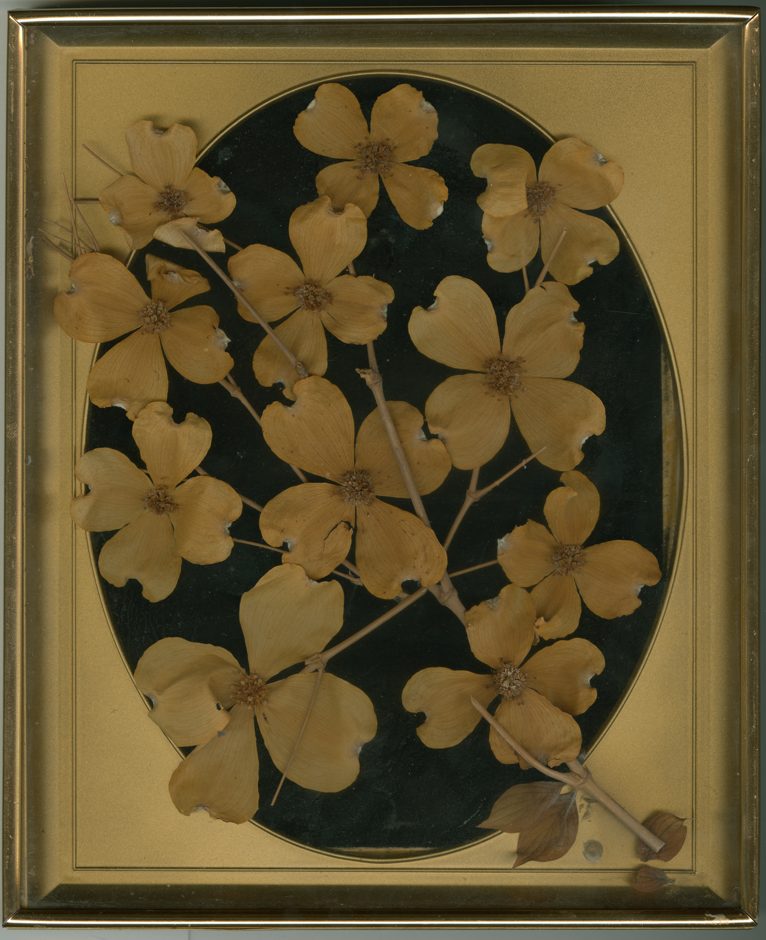 Shadow box frame with eleven dried dogwood flowers on stems. Sticker states "an Original" by James R. Hawkins, Springfield Mass. "Keep out of Direct Sun".