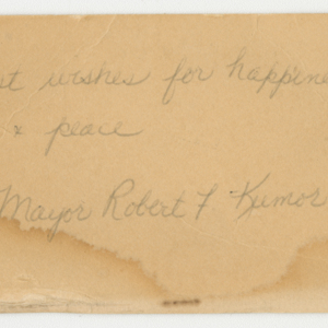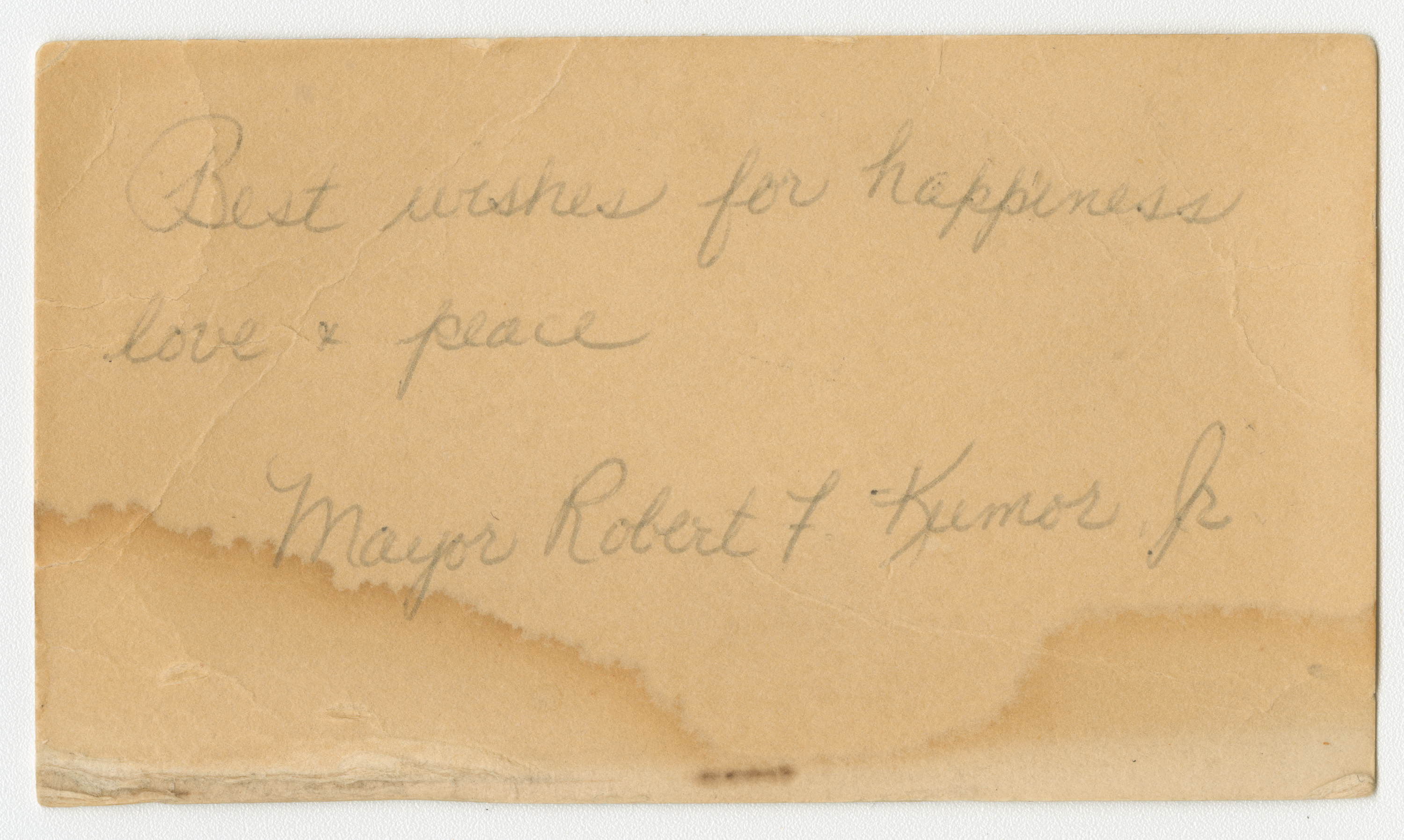 Gift card: "Best wishes for happiness love & peace. Mayor Robert F. Kumor Jr."