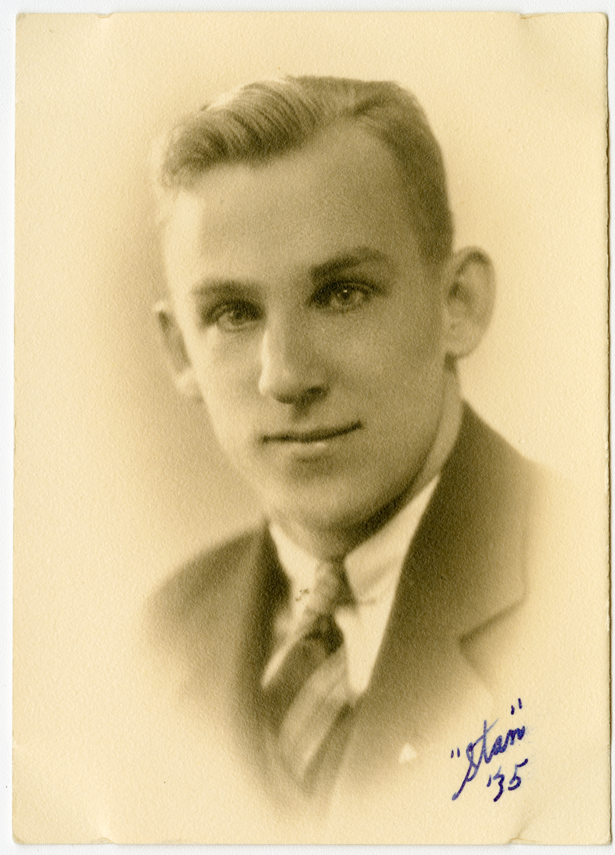 Senior portrait of a young man from the Chicopee High School Class of 1936 showing head, shoulders and face with the shoulders facing to the front. The subject is turned slightly to the left of the frame. Soft light illuminates most of the face. The subject is wearing a dark jacket with a white shirt and a striped tie. Writing on the bottom right of the print says "Stan "35"."