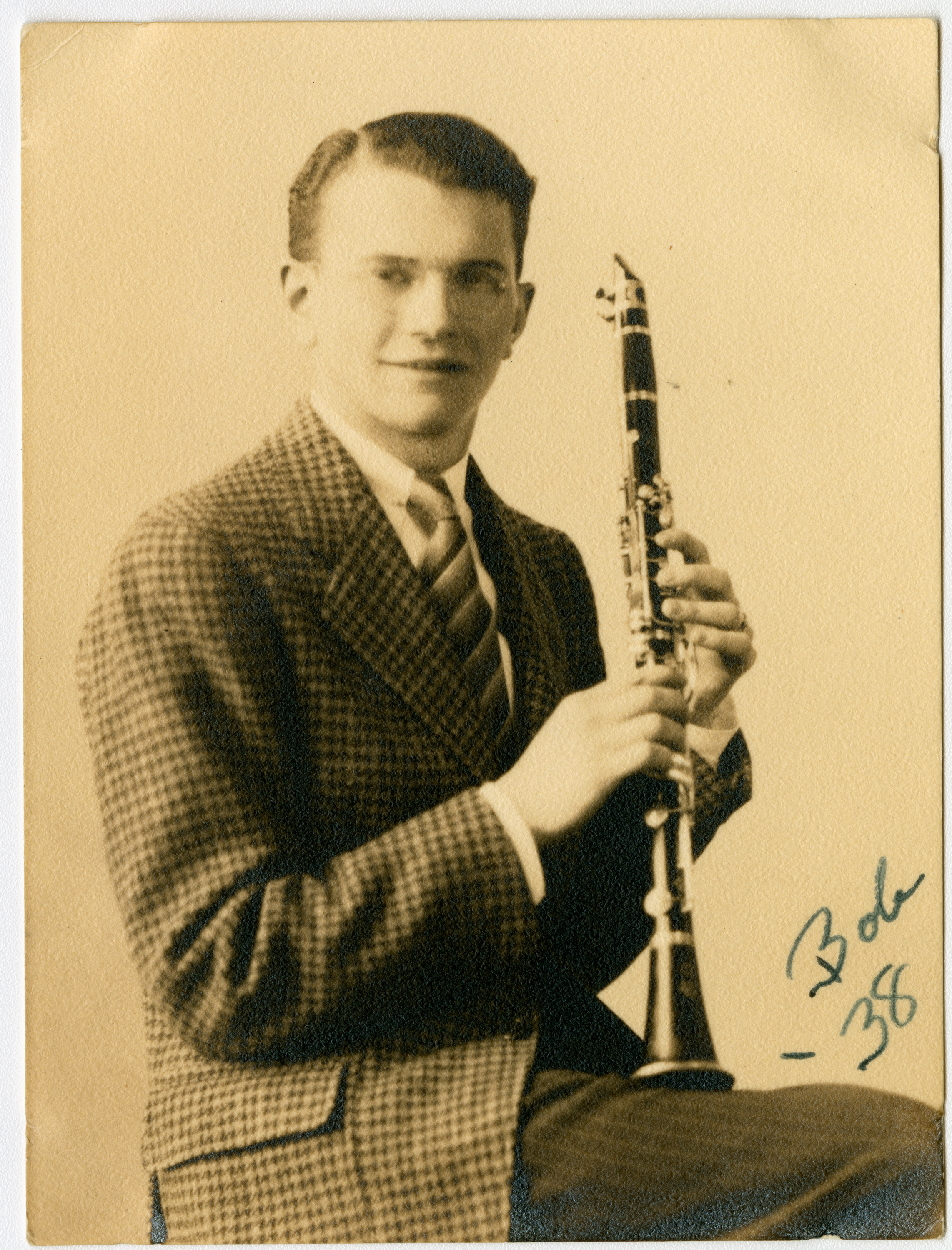 Senior portrait of a young man from the Chicopee High School Class of 1936 showing head, shoulders and face with the shoulders facing to the front. The subject is turned to the right side of the frame and looking at the camera. He is holding a clarinet in his hands and it is resting on his leg. Soft light illuminates most of the face. The subject is wearing a checkered jacket with a white shirt and a dark striped tie. Writing on the bottom right of the print says "Bob '38."