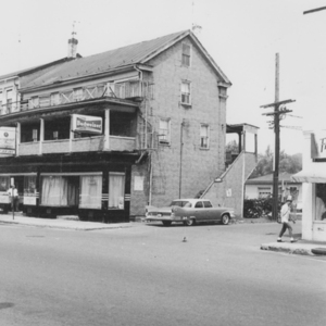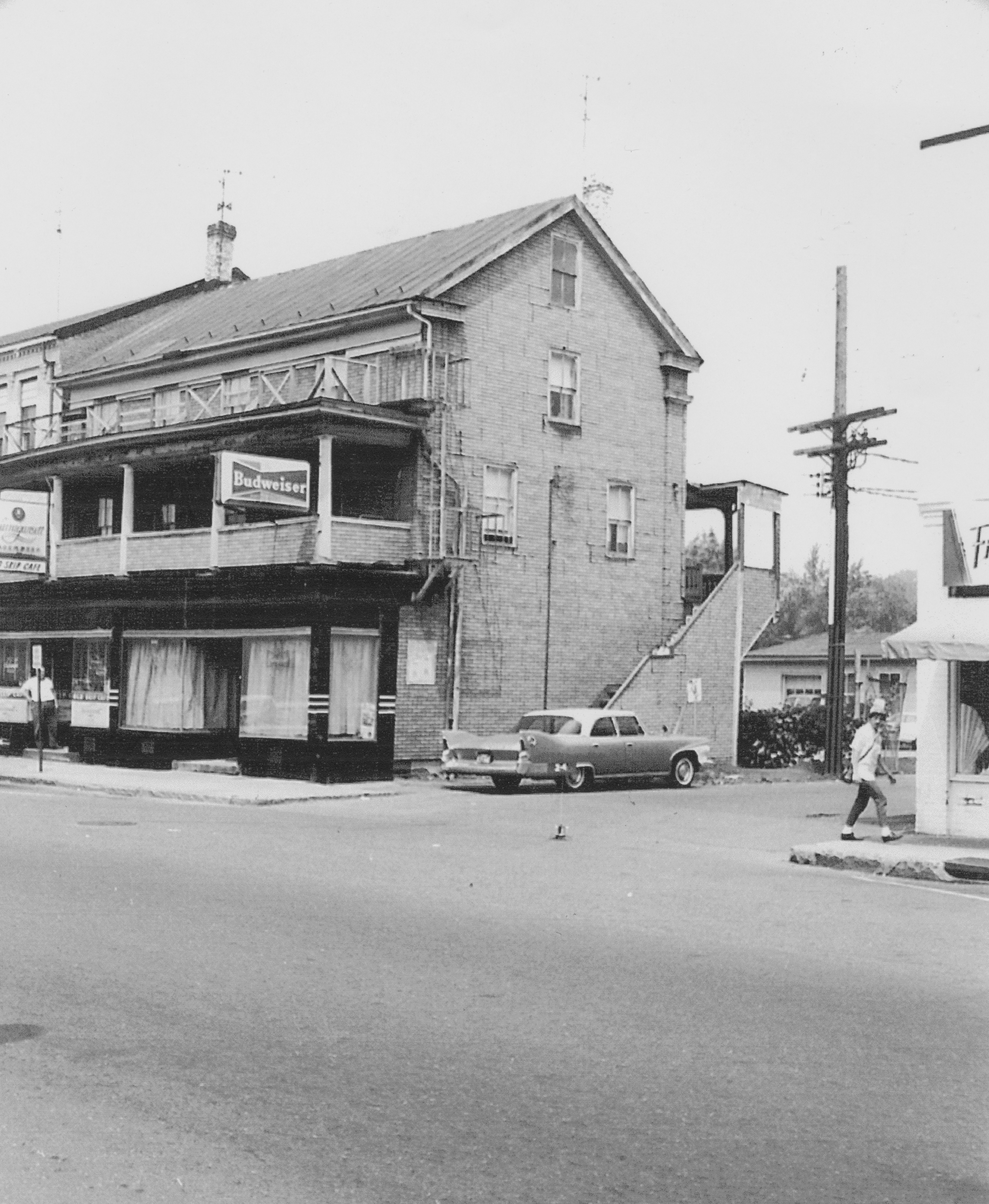 Main Street and the Old Skip Cafe. One of the many cafes and watering holes that catered to the mill and manufacturing workers in Chicopee Falls prior to the Urban Renewal era.