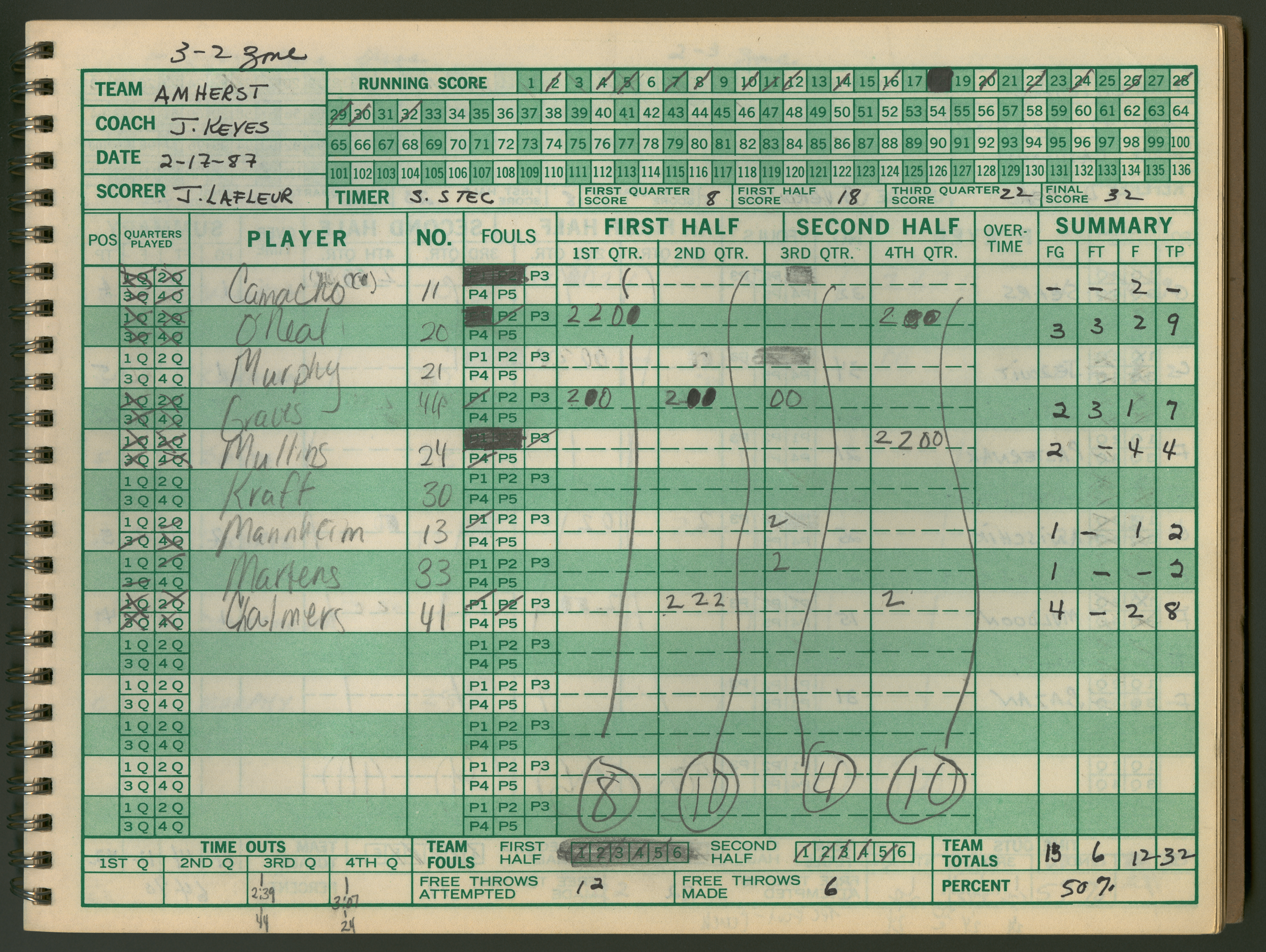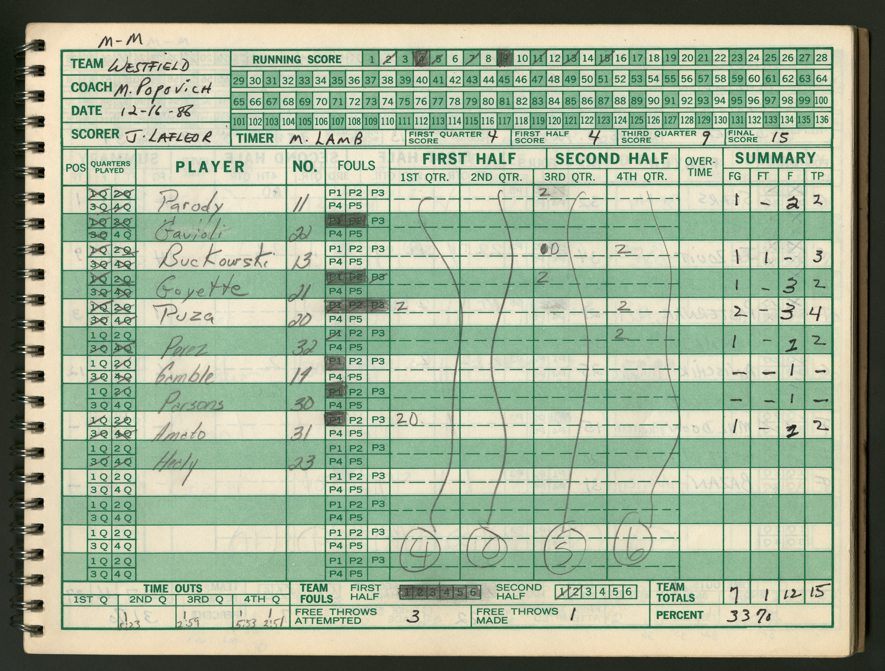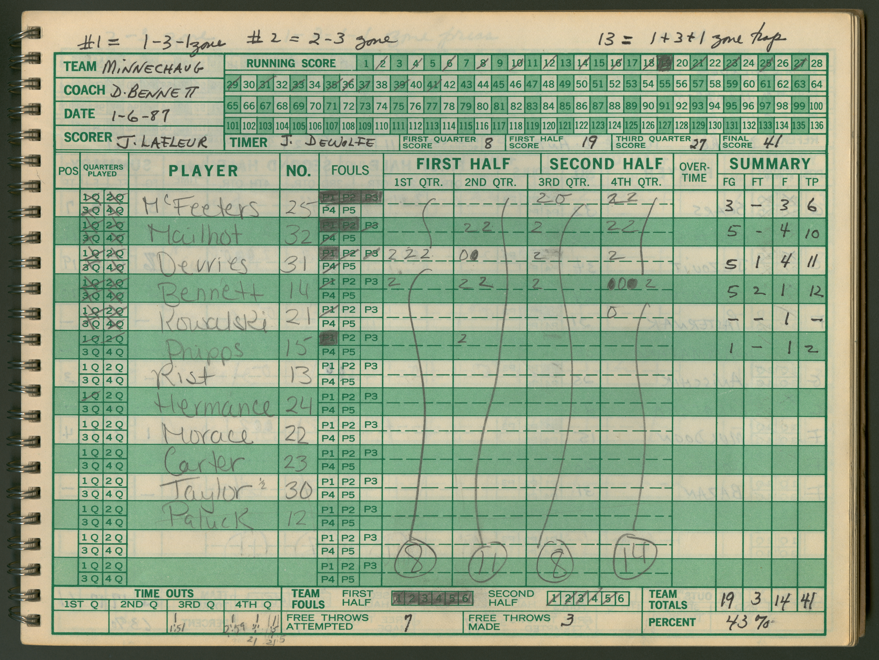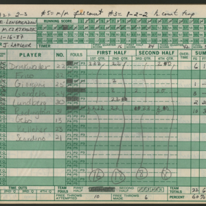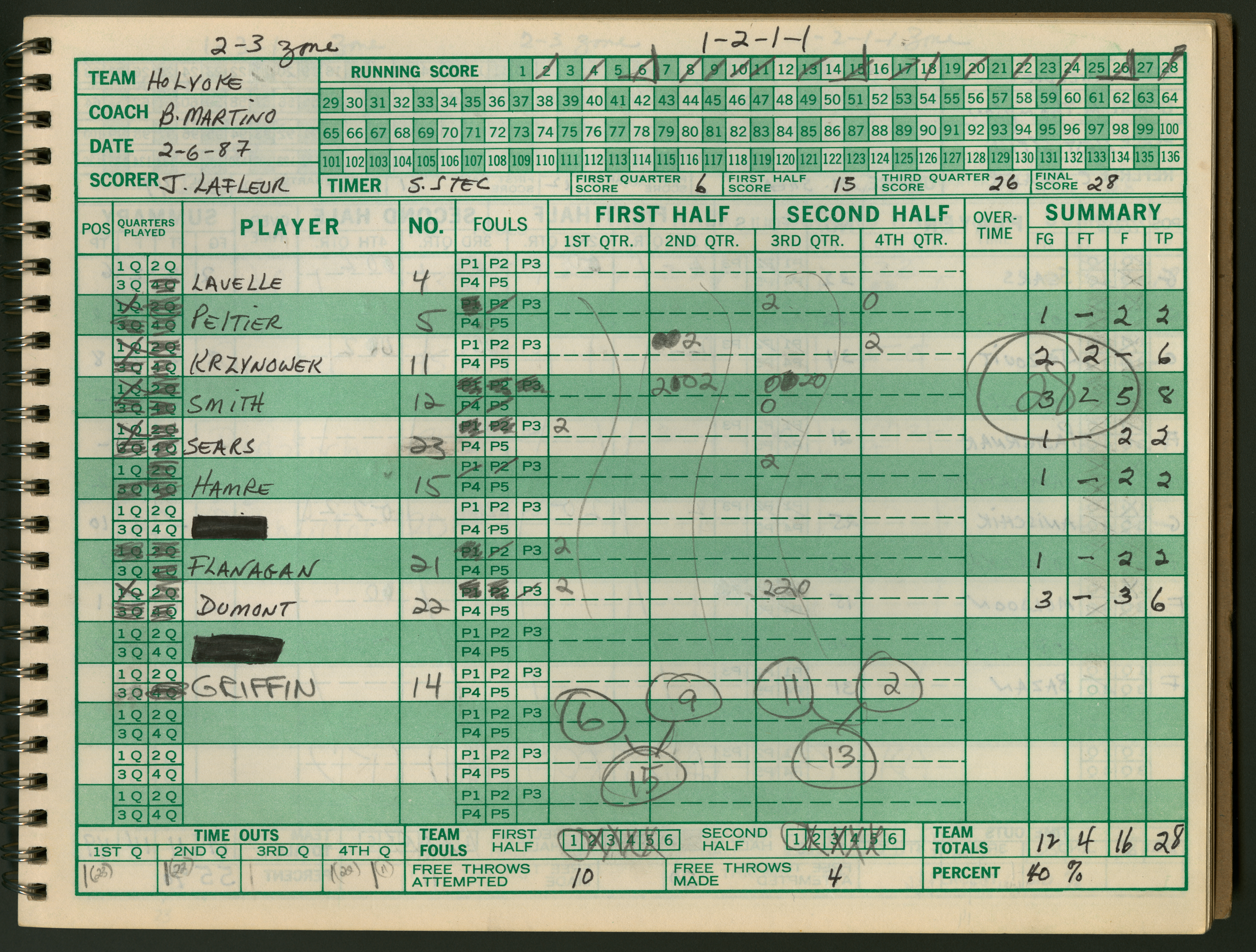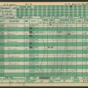 Official Scorebook of the 1986 - 1987 girl's varsity basketball season. Each entry lists the names of the players as well as the complete scores. Coach notes of the game are provided between Chicopee and the opposing team. The 1986 - 1987 season was Coach Thompson's seventh year as head coach.