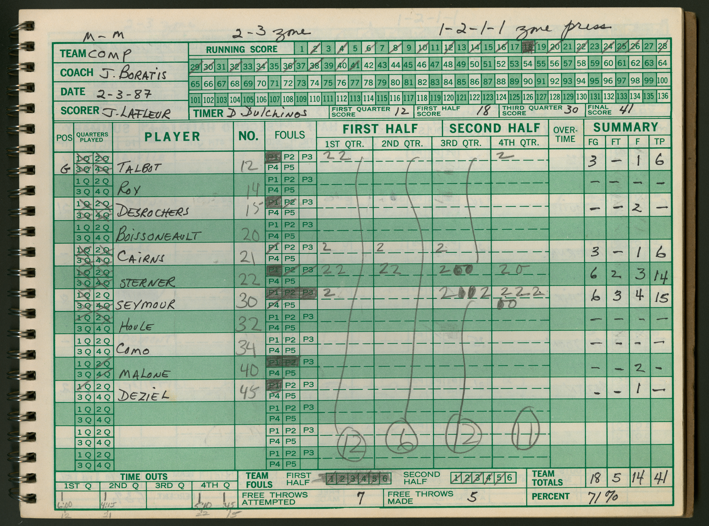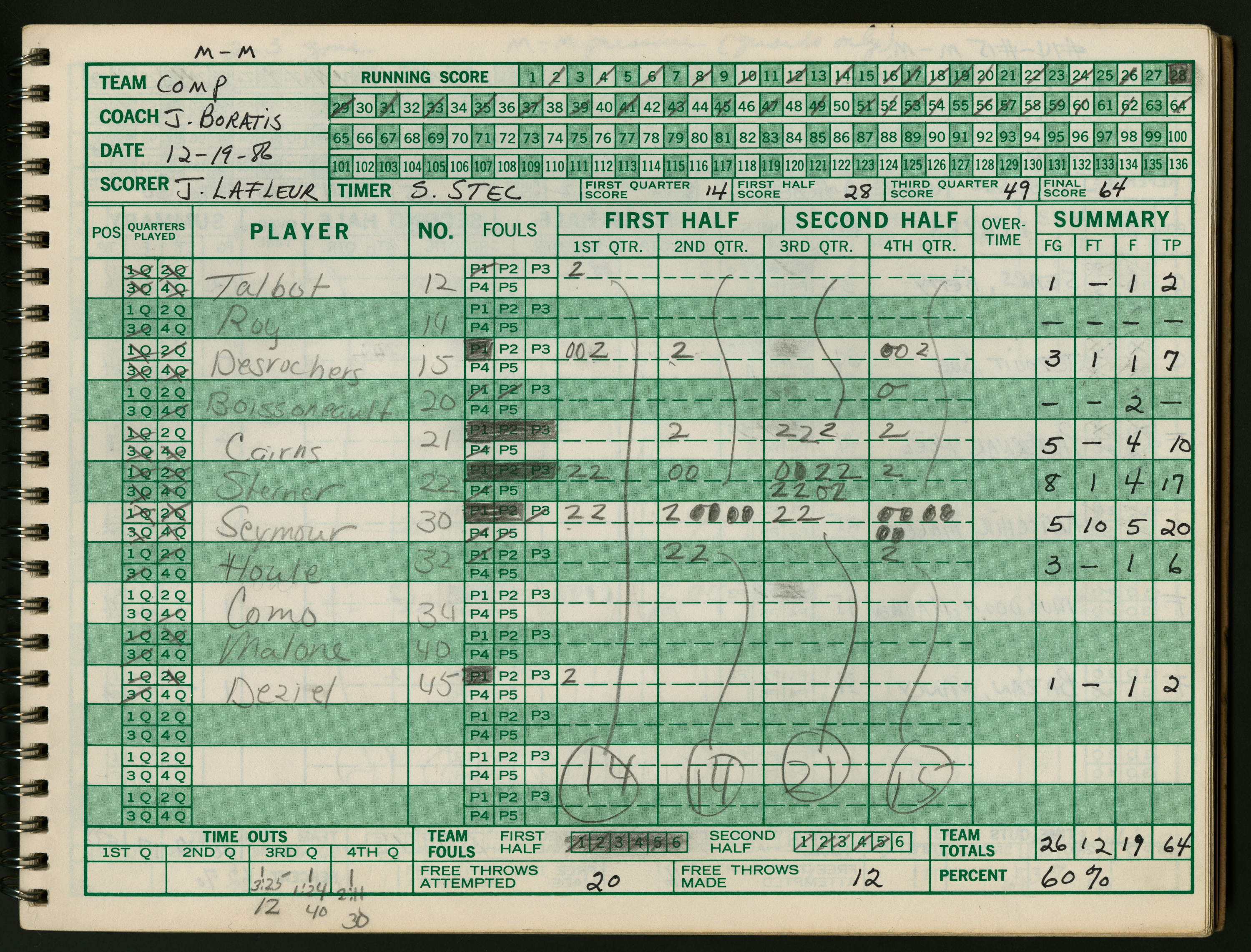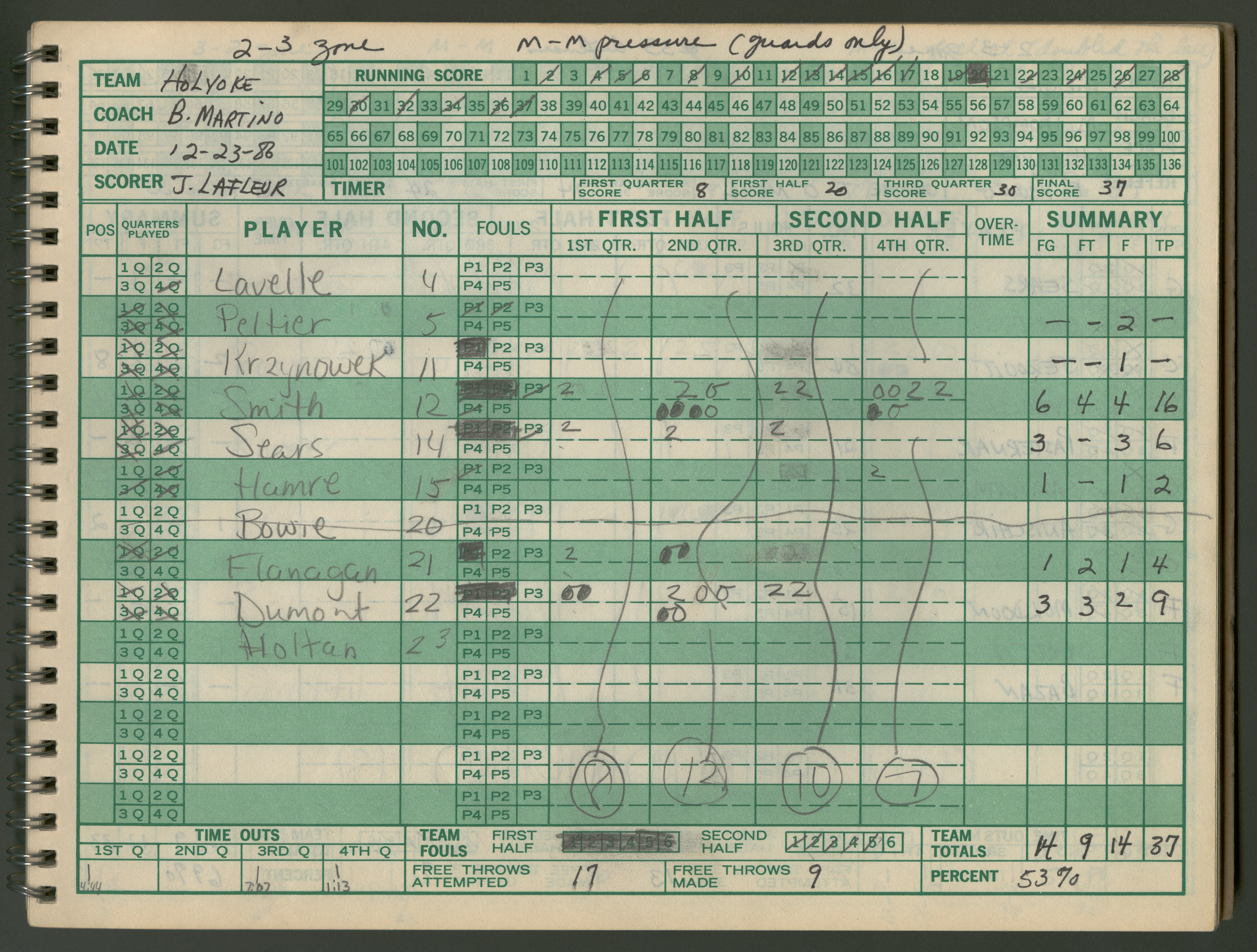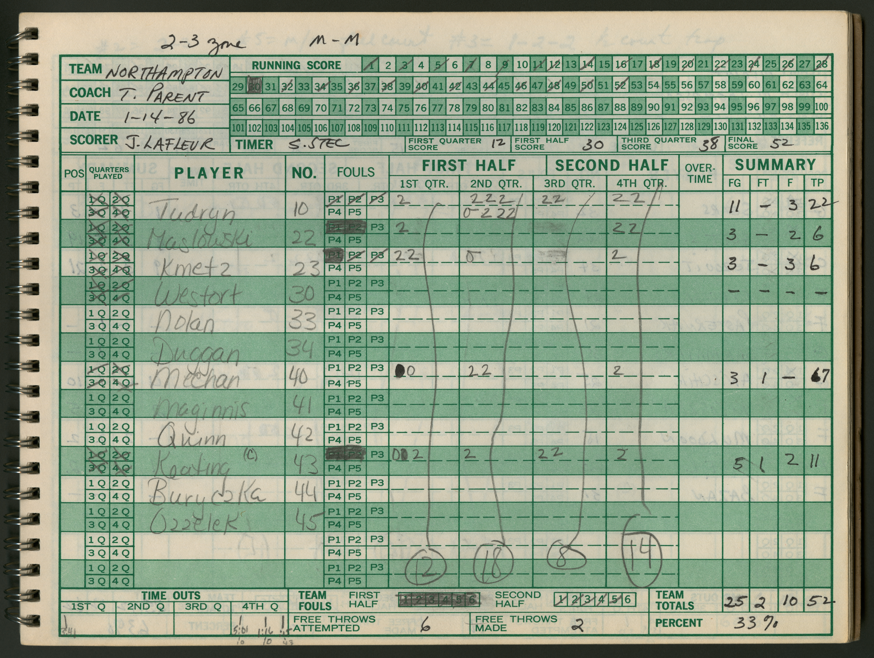 Official Scorebook of the 1986 - 1987 girl's varsity basketball season. Each entry lists the names of the players as well as the complete scores. Coach notes of the game are provided between Chicopee and the opposing team. The 1986 - 1987 season was Coach Thompson's seventh year as head coach.
