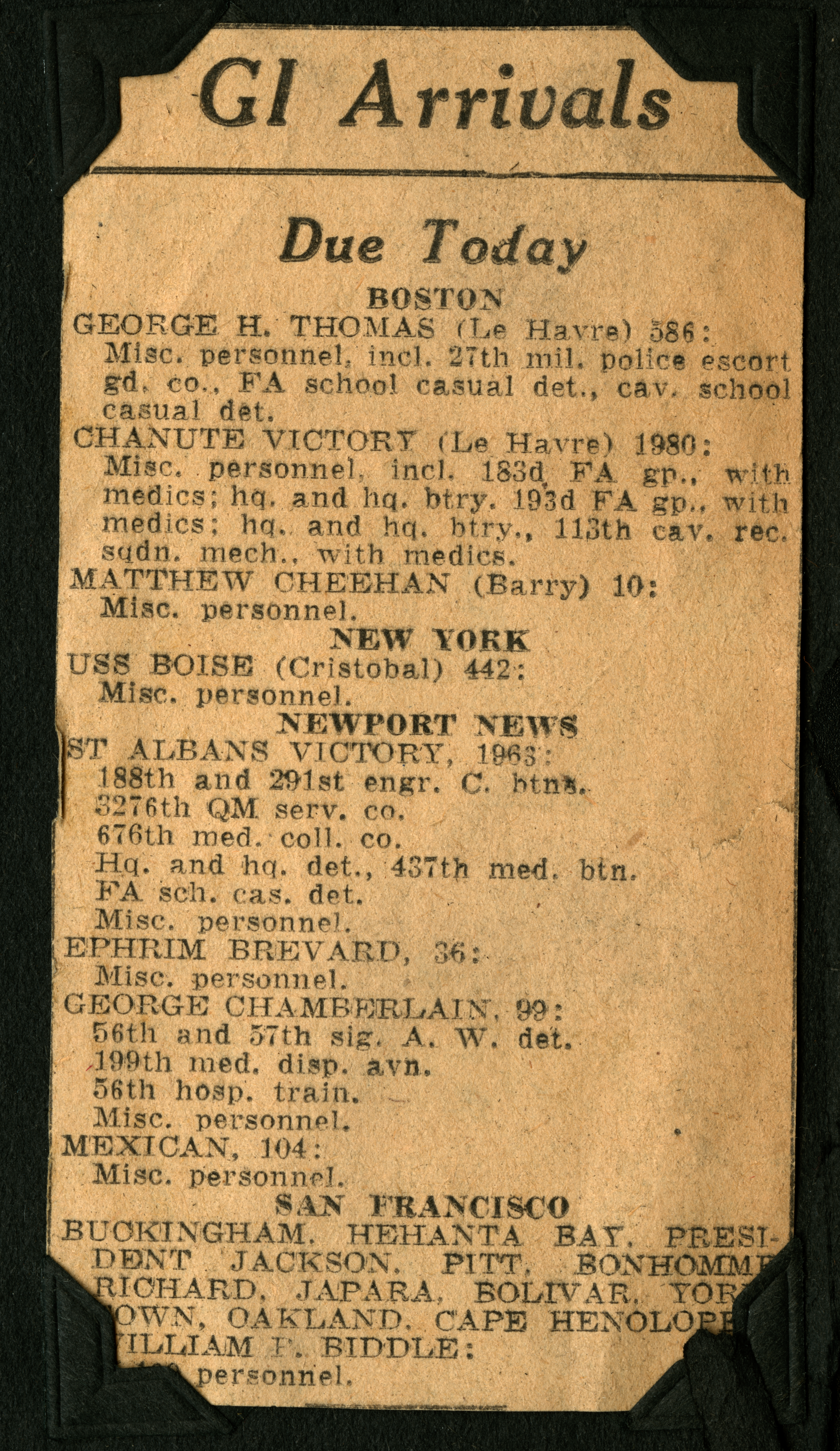Newspaper clipping of GI arrivals in U.S.