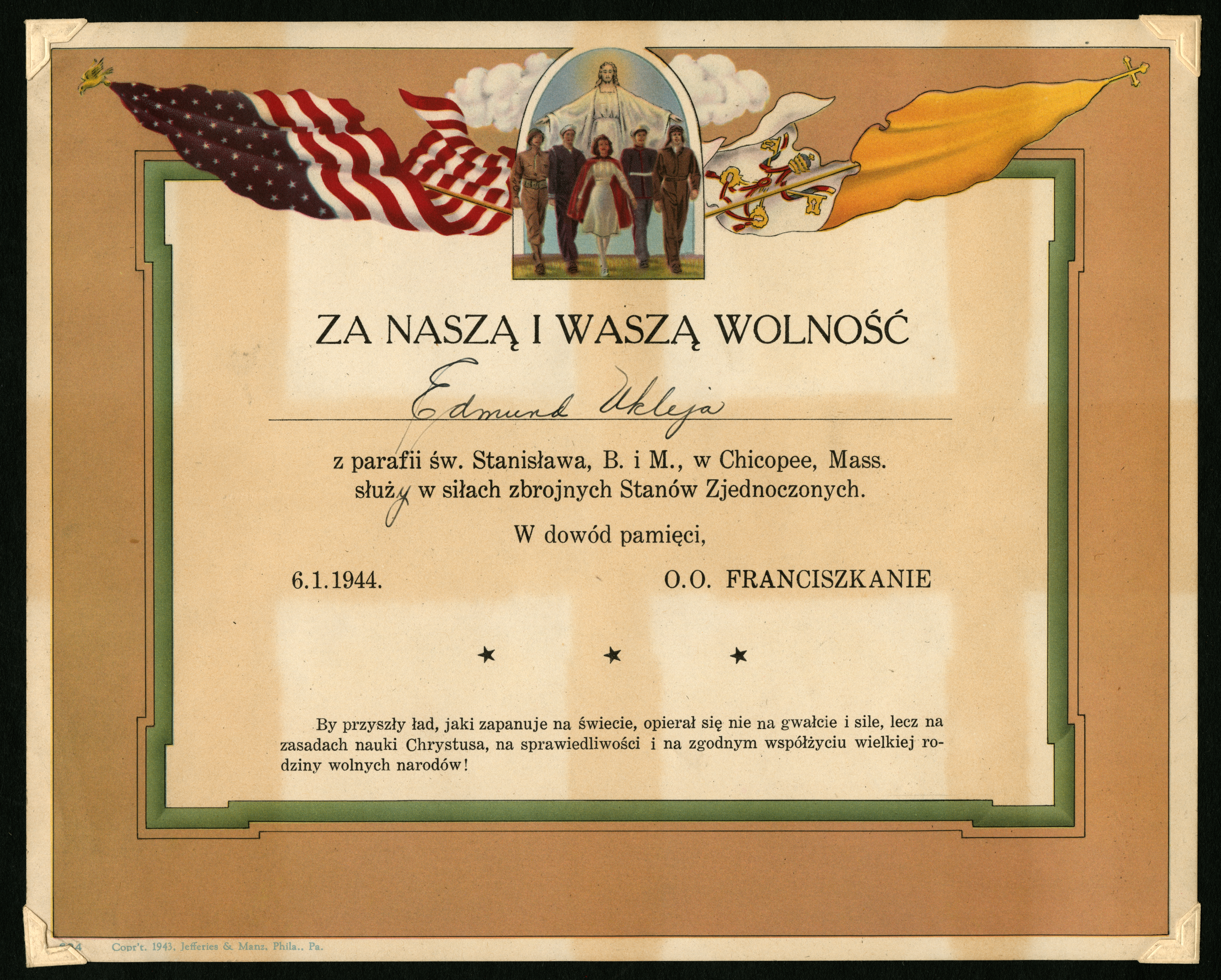 The top has a seal of an American flag on the left, a flag of the St. Stanislaus Basilica Fransiscan Friars on the right, with a seal depicting Christ behind a group of five servicemembers, men and women, including a nurse in the center. A translation of the Polish text reads: "For our freedom and yours Edmund Ukleja, from the parish of St. Stanislaus Basilica and M., in Chicopee, Mass. serves in the armed forces of the United States. In memory, 6.1.1944. Order of the Franscicans. May the future order that will prevail in the world be based not on violence and force, but on the principles of Christ's teaching, on justice and on the harmonious cooperation of a great family of free nations!"