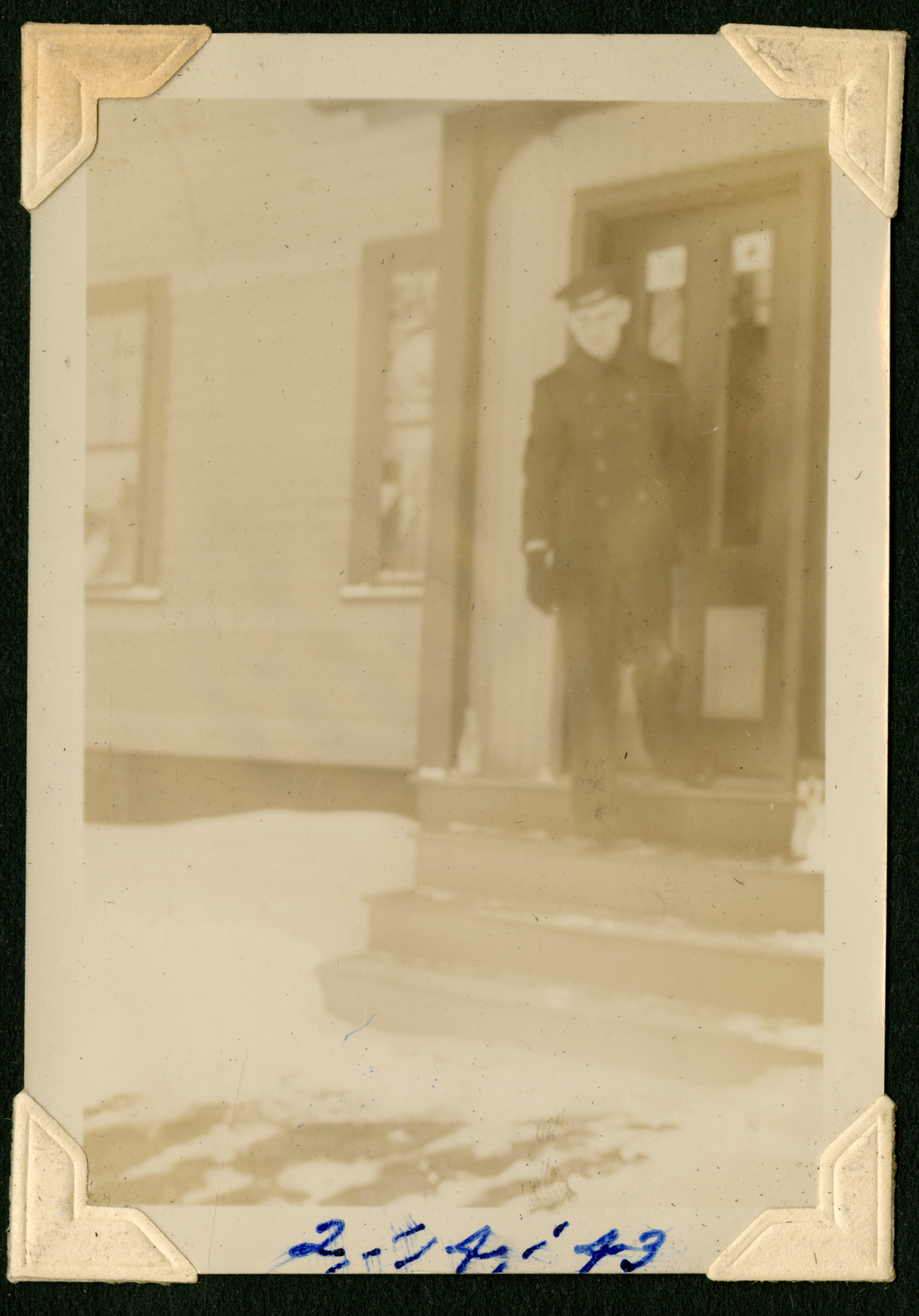 Blurry photograph of a young man in a naval hat, coat, gloves, and slacks standing on the front steps of a building. Snow is on the ground. The bottom of the photograph is dated 2/14/43. Printed on back of the photo in the top left corner in sideways is the number 43.