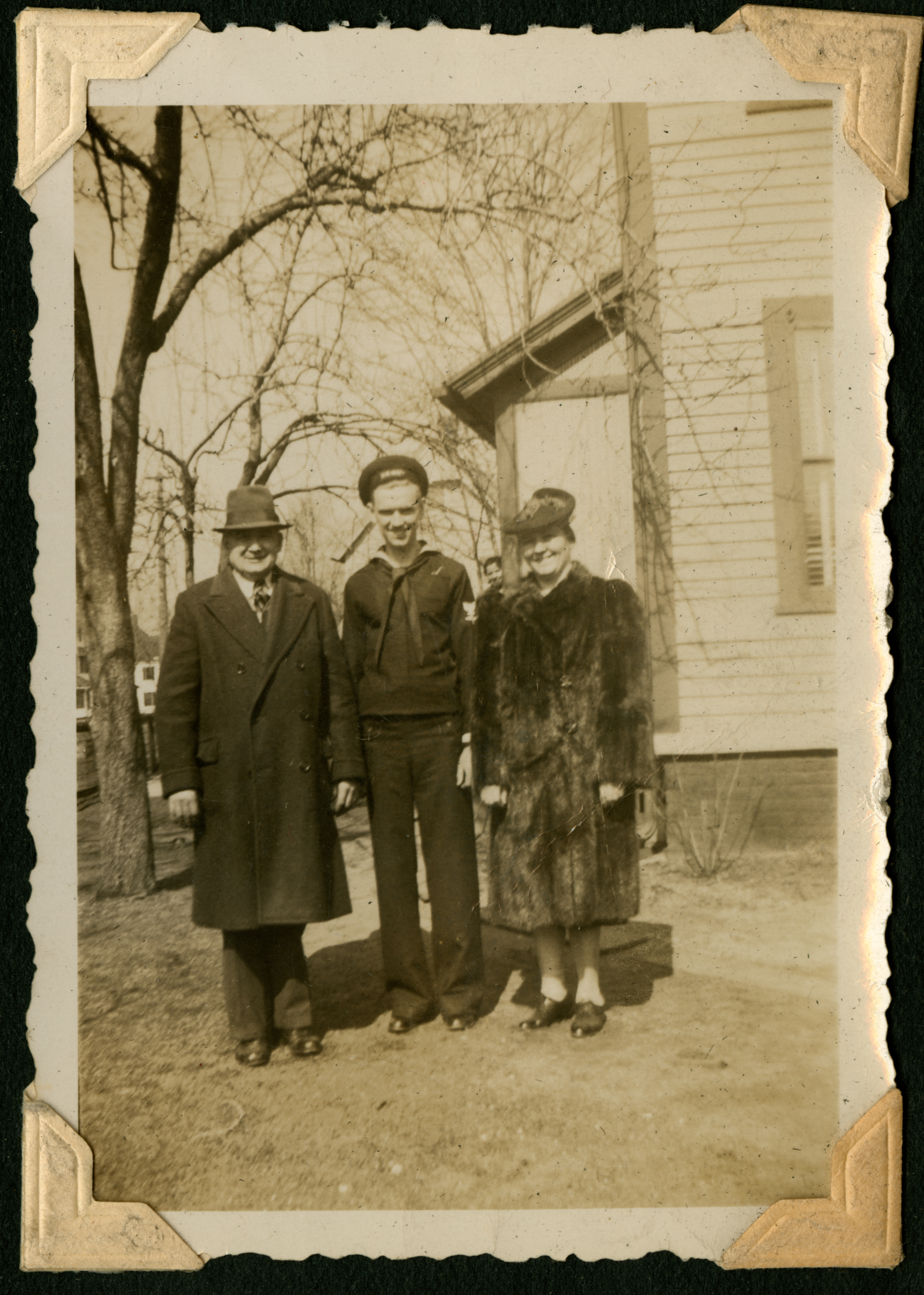 A group of three people standing together. On the left is an older man in a suit, with a long coat and hat; to his right is a young man in a naval uniform; to his right is an older woman in a long fur coat and a hat. They are standing outside, on grass, in front of a house, with trees and another house in the background. The face of one more person is in the background, between the shoulders of the young man and the older woman. Printed on the back of the photo in the bottom left corner sideways is the number 002.