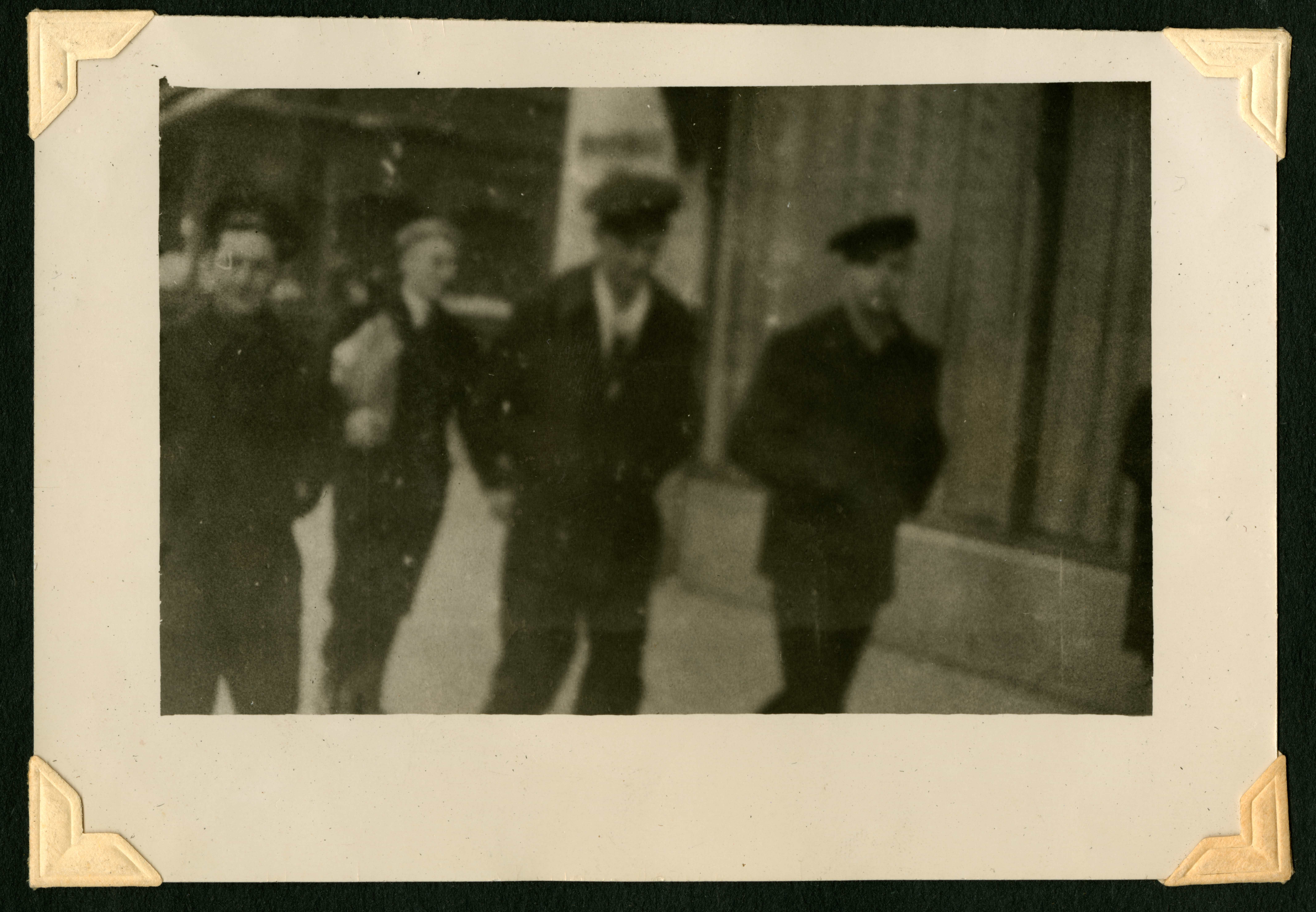 A blurry image of four men walking down a street. There are three men waking seemingly together, wearing hats, with one man carrying a paper back in the background. The first (left) and fourth (right) men are looking towards the camera. They appear to be walking in front of a storefront. On the back of the photo, at the top, is written in pencil 51950A and below that 3.