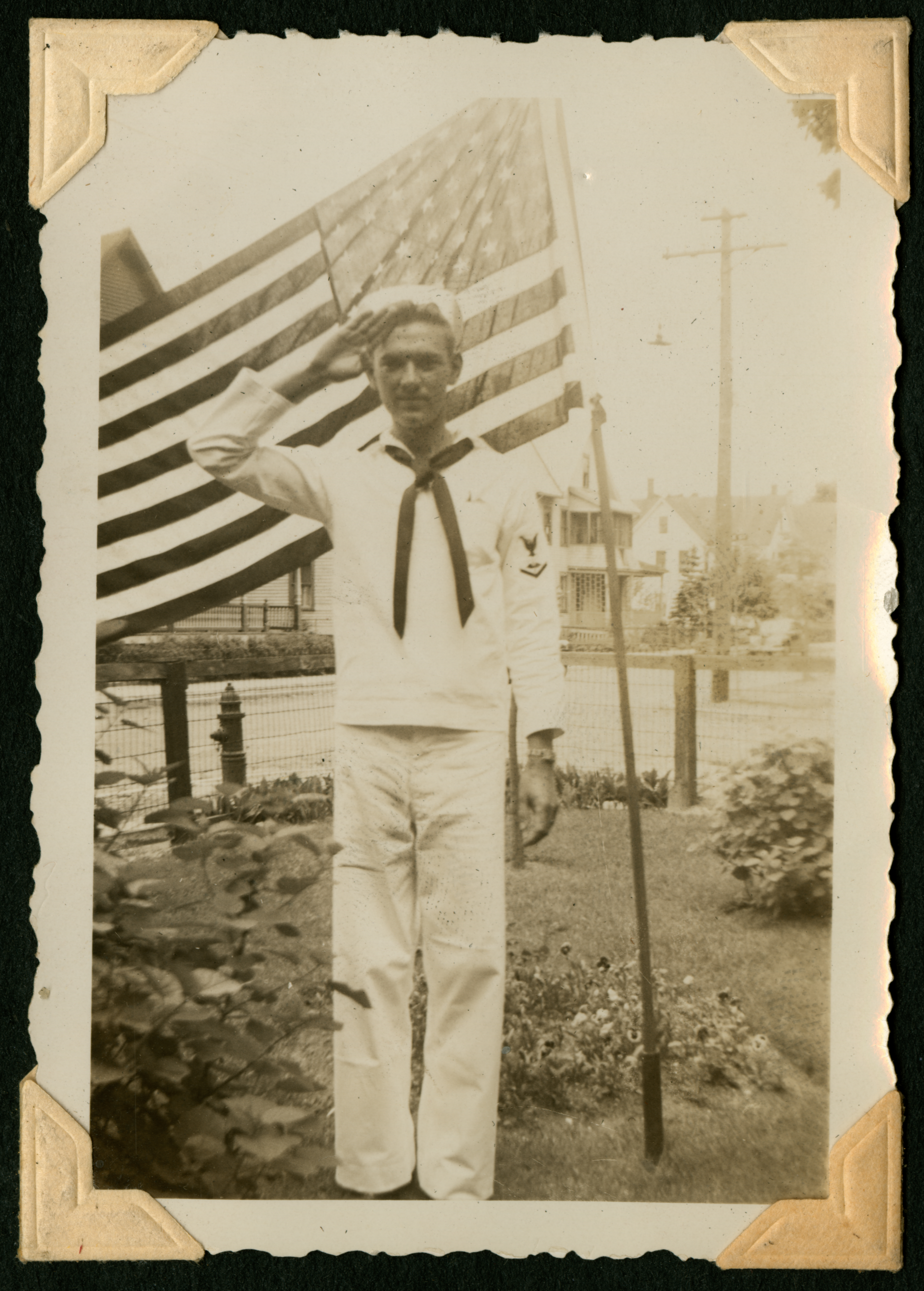A young man in a white naval uniform standing and saluting outside in front of an American flag. In the background are plants, a fence, and what appears to be a street. On the back of the photo in the lower left corner is some faded ink, an undecipherable number, with 268 written above it in pencil.