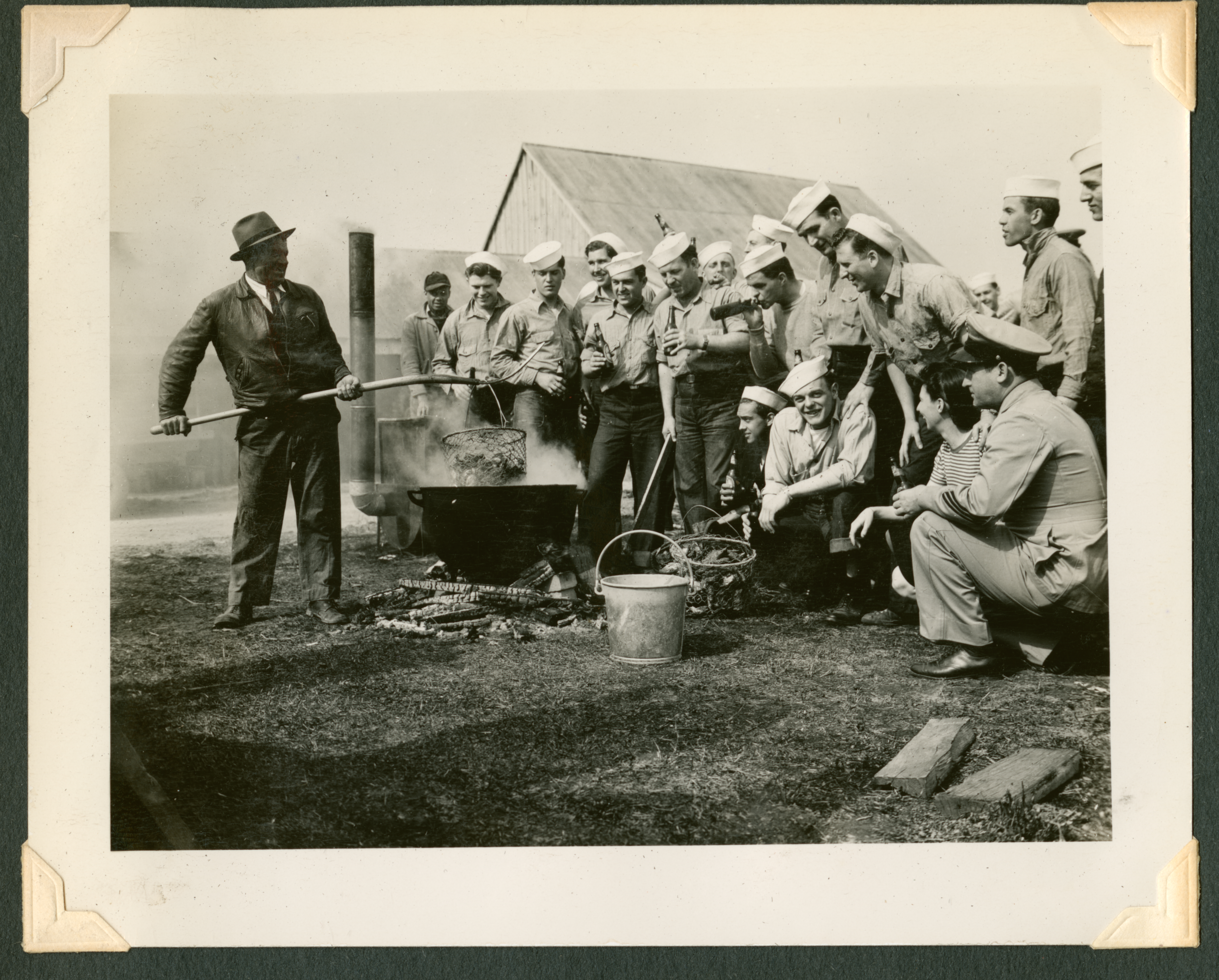 A group of people outside cooking. There is steam or smoke obscuring some of the background, but there is building in the background. A man (left) holding what appears to be a bucket of seafood that has been steamed in a large pot on a fire. A group of young naval officers, wearing casual clothing and their white hats, stand and crouch to his right, looking on. Some hold glass bottles. Many appear to be smiling, laughing, and talking. On the back of the photo, the number 593 is stamped in ink.