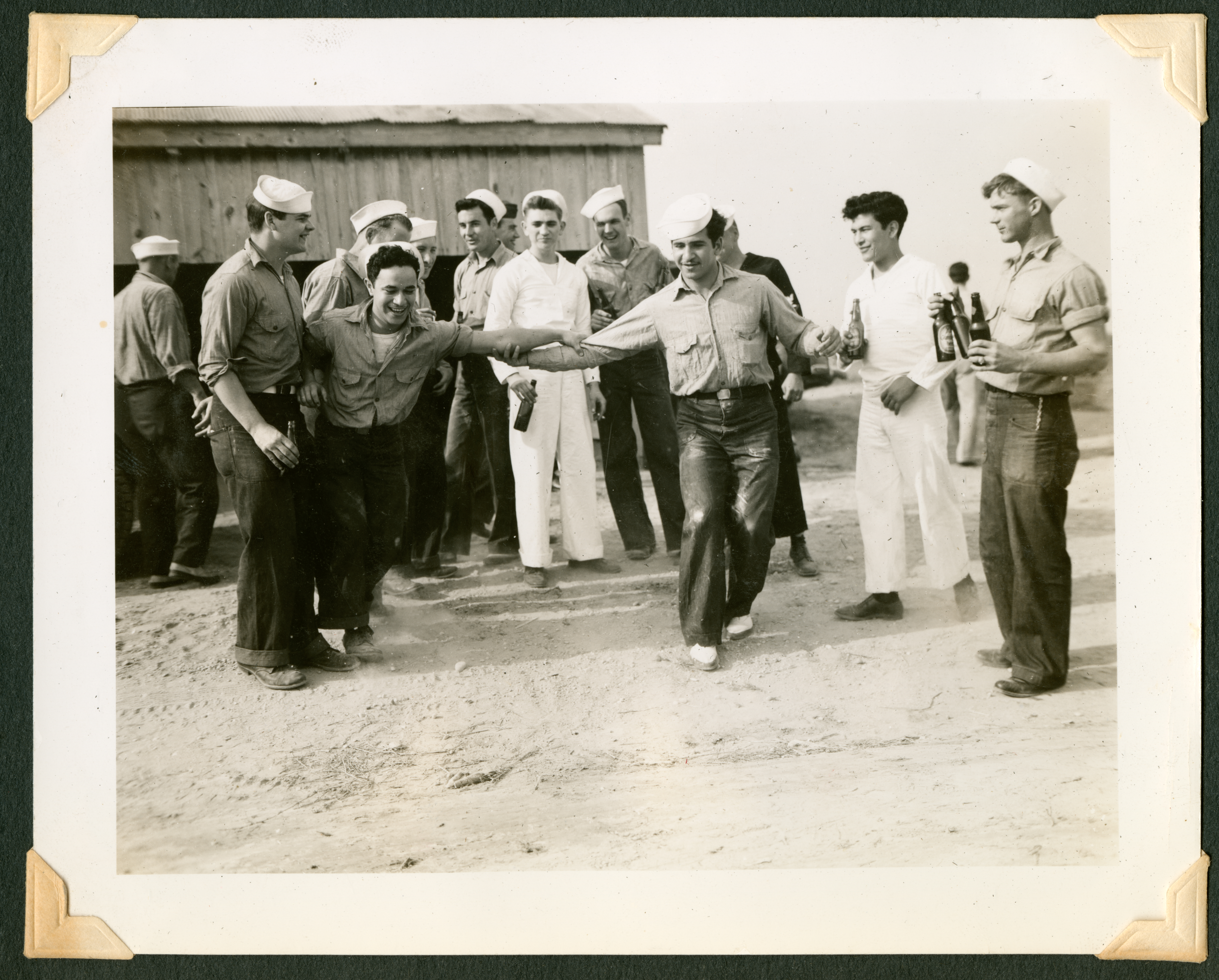 A group of young men standing outside on some dirt. Five men stand in the foreground, and about nine stand in the background. Most are wearing white naval caps. The first (left) and third of the men in the foreground have grabbed the arms of the second man, who is smiling but appears to be stumbling down. The first man is holding a bottle in his right hand as he holds up his friend. The two others stand at the side, one is laughing and holding a bottle, and the other is holding three bottles. On the back of the photo, the number 358 is printed in ink.