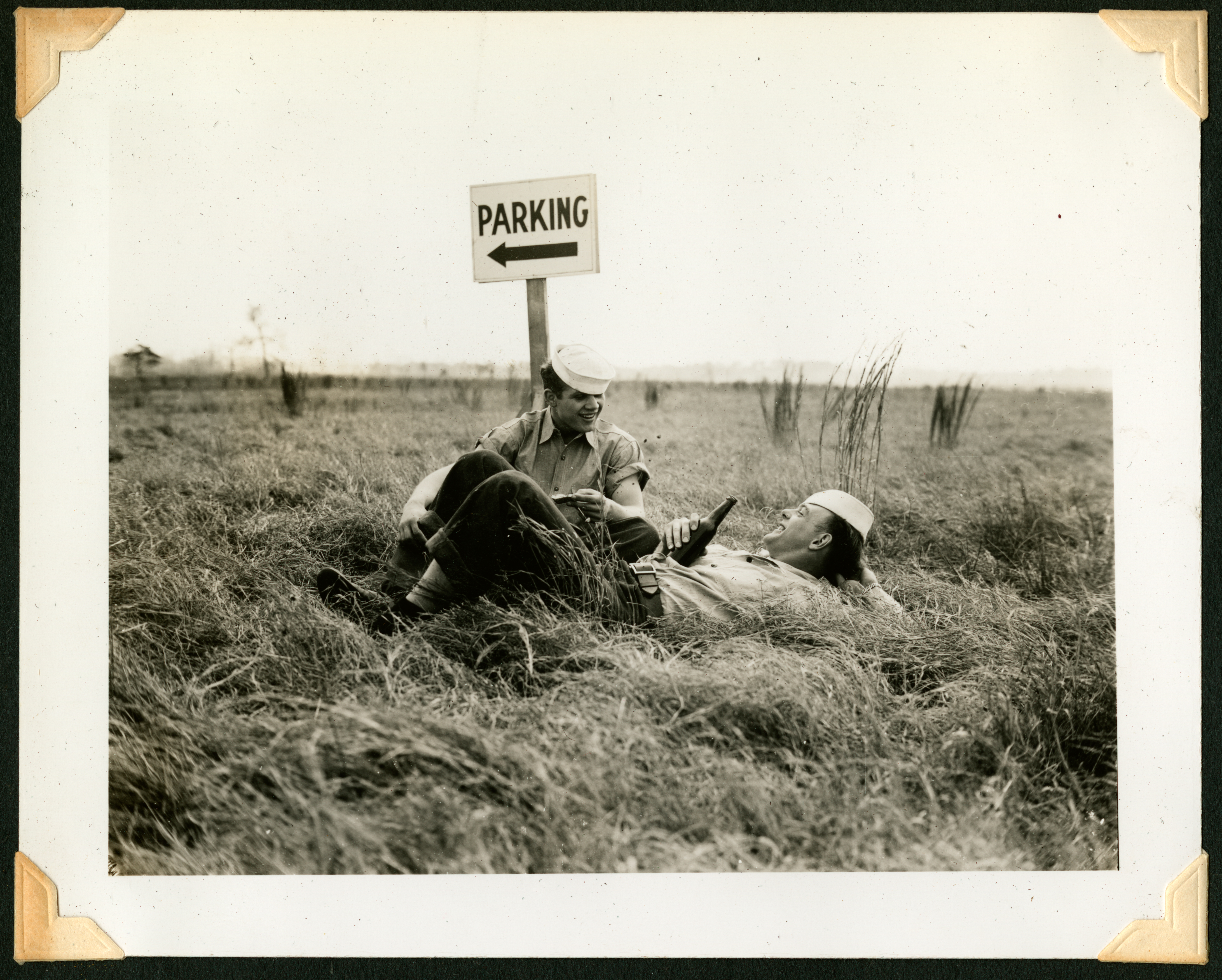 The image is of two young men wearing white naval caps. One sits, leaning towards the other and smiling, while the other man lays down on his back, hand behind his head, bottle in his other hand, and smiling towards his friend. They are on the ground in tall grass, right in front of a sign that says "PARKING" with an arrow pointing left below it. On the back of the photo, the number 358 is stamped in ink.