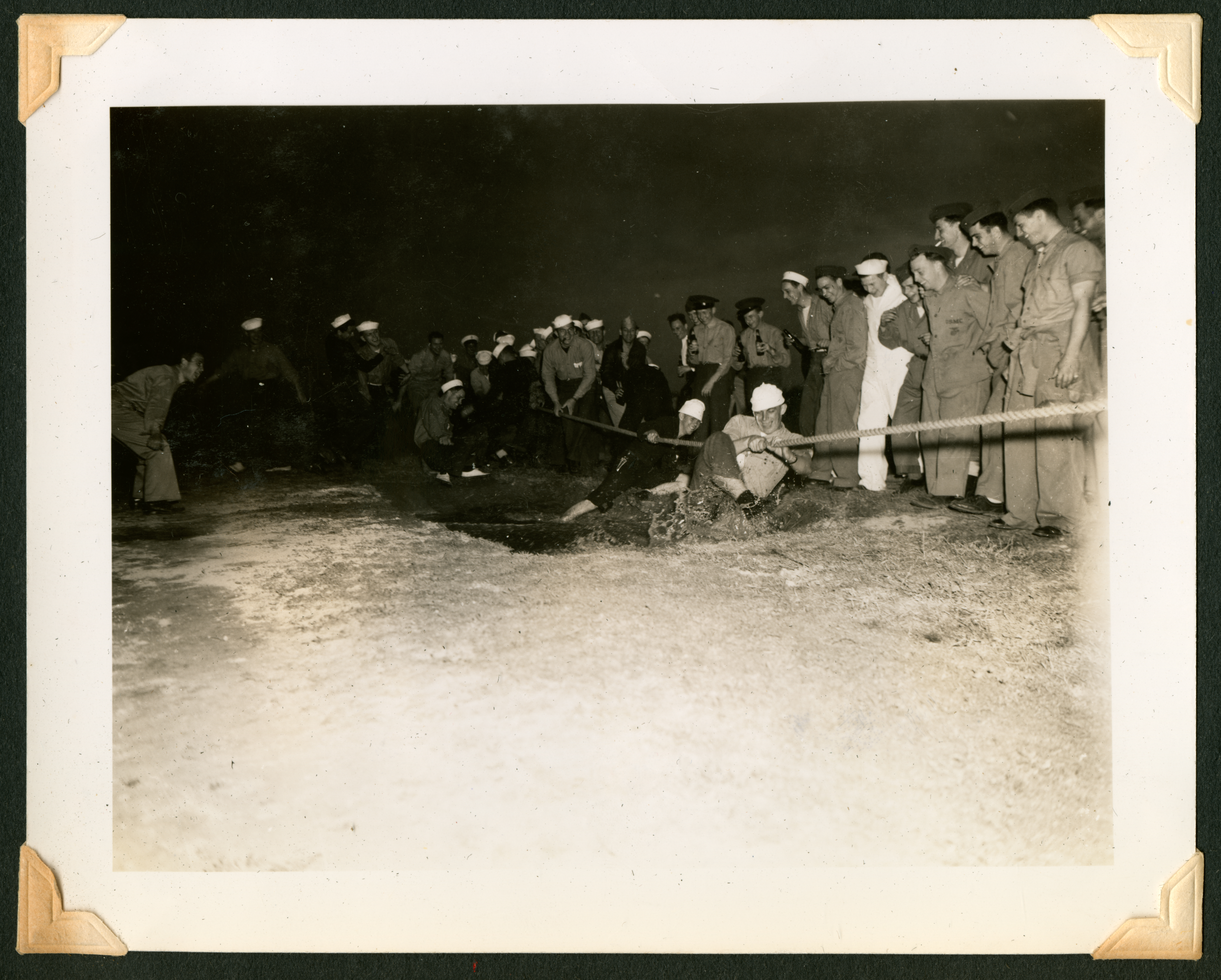 The image shows two young men wearing white naval caps grabbing a rope as they attempt to pass through a pit of water in a tug-o-war game. There is a crowd of spectators in military uniforms looking on, smiling, and holding bottles. On the back of the photo, the number 358 is stamped in ink.