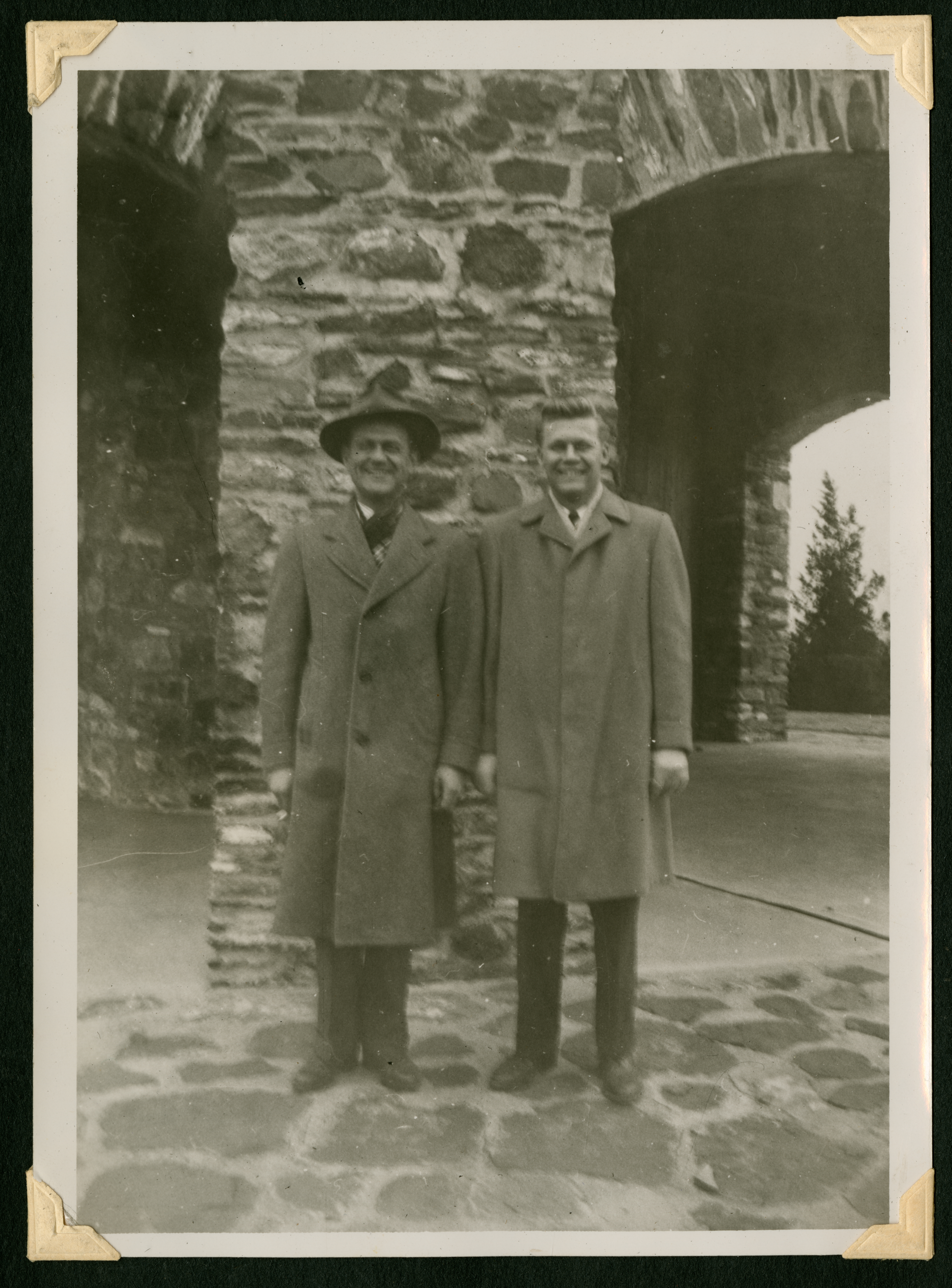 A photograph of two men standing side by side, shoulder to shoulder, in front of a stone structure. The man on the left is wearing a hat and long winter coat and is smiling. The man on the right is also wearing a long winter coat, seemingly over a suit, and is smiling. In the background, on the right side, is an opening from the building they are in with a tree in the background.