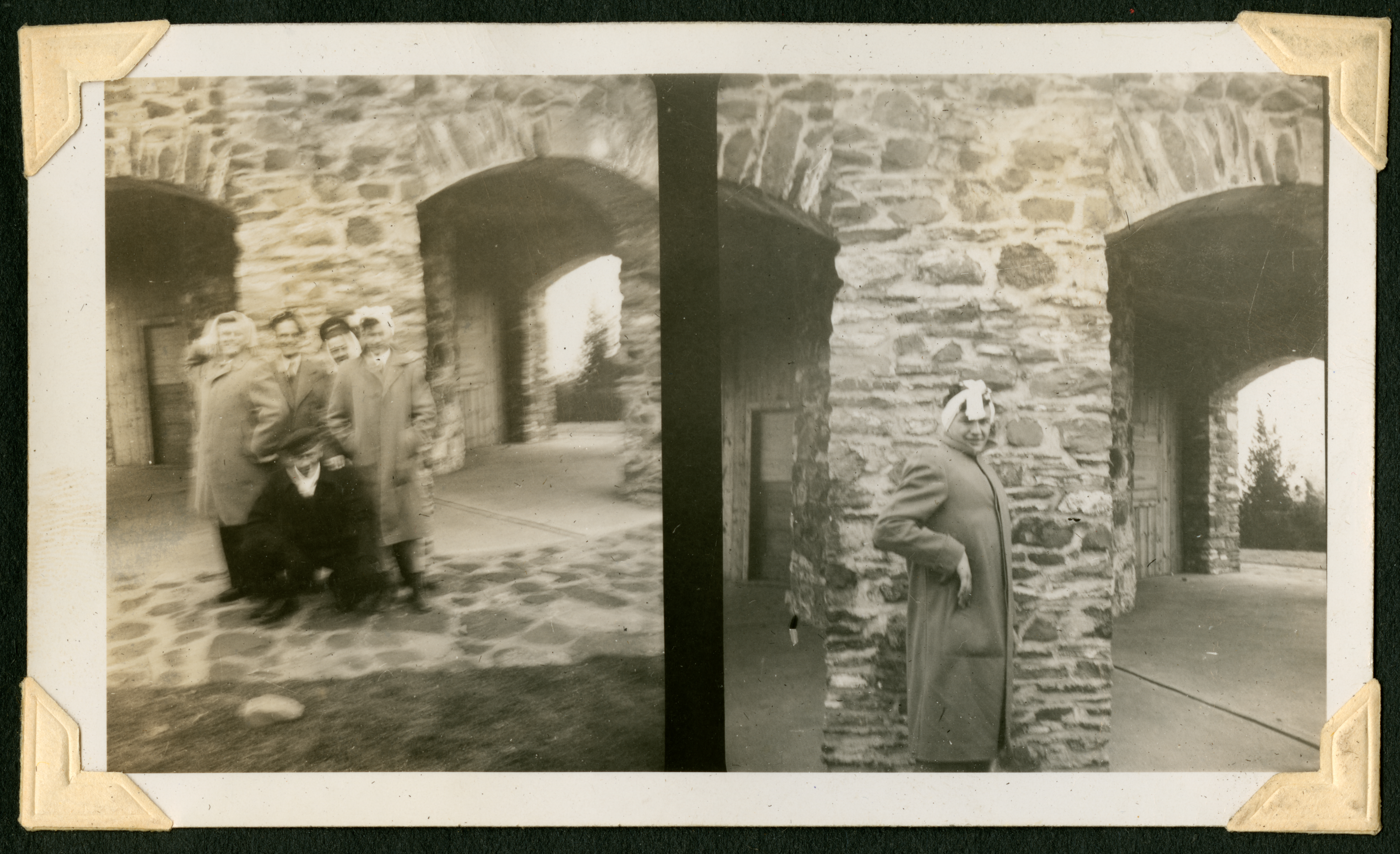 Two photographic images printed in a diptych-style format. The left side image is blurry and shows a group of five men in front of a cobblestone building, and the right image shows one young man standing in profile in front of a stone pillar.