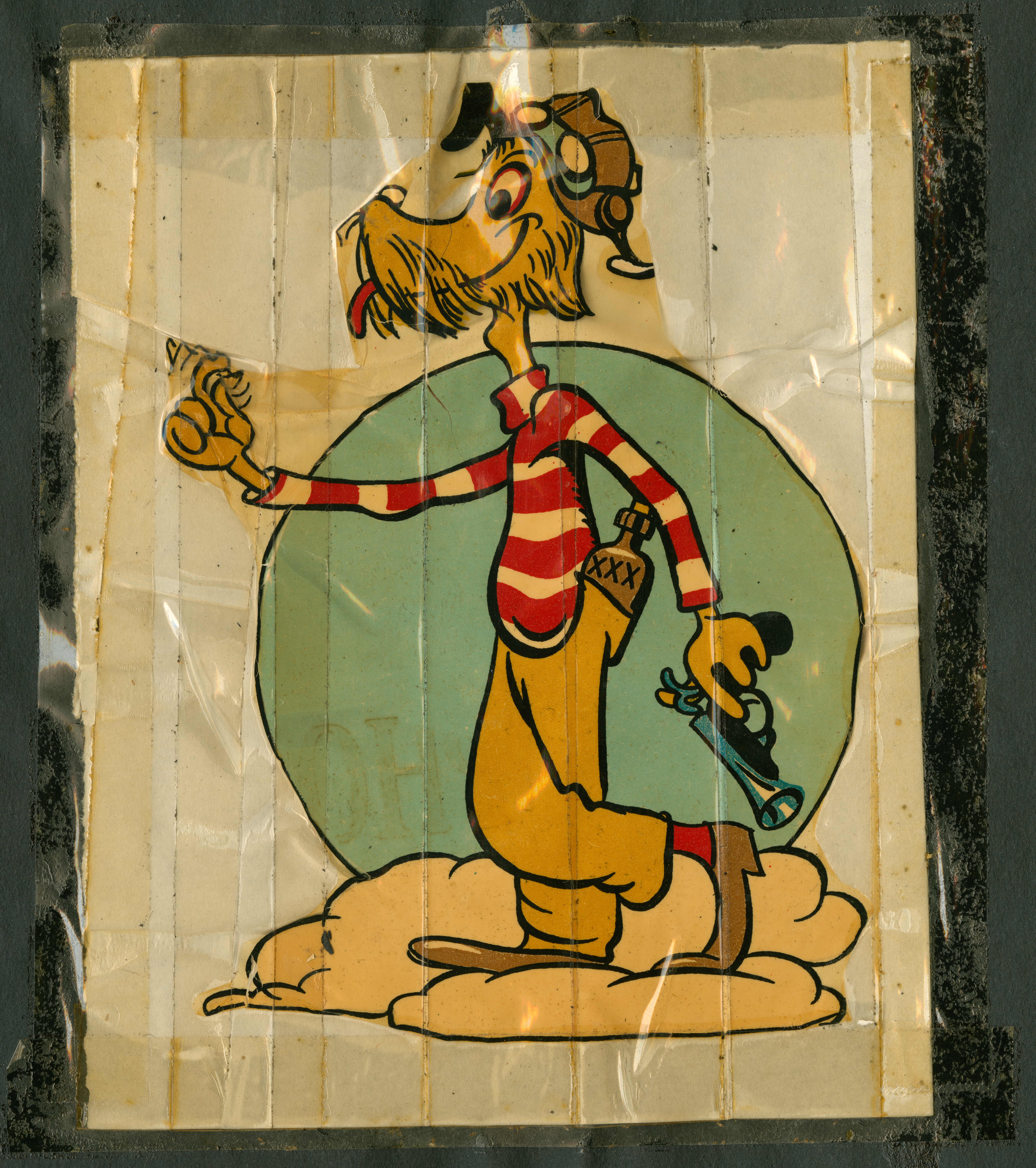 The image is a cartoon figure, remniscent of Dr. Seuss's characters. It shows an animal (dog?), wearing a striped red and white shirt, khaki pants, red socks, brown shoes and an old-style aviator helmet with goggles. The figure is standing against a blue-green circle and on top of a puffy shape that is a tanned-yellow color, possibly a cloud. The figure stands in profile with his legs crossed. His right arm is outstretched, fingers snapping. His right hand is down behind him and holding a cartoon gun. There is a liquor bottle with three Xs (XXX) in his back pocket. The figure has a red ring around his eye and his tongue sticking out. A faded "OH" in bock letters can be seen on the left side of the blue-green circle, as if shining through from the back or the imprint of another page on top of this image.