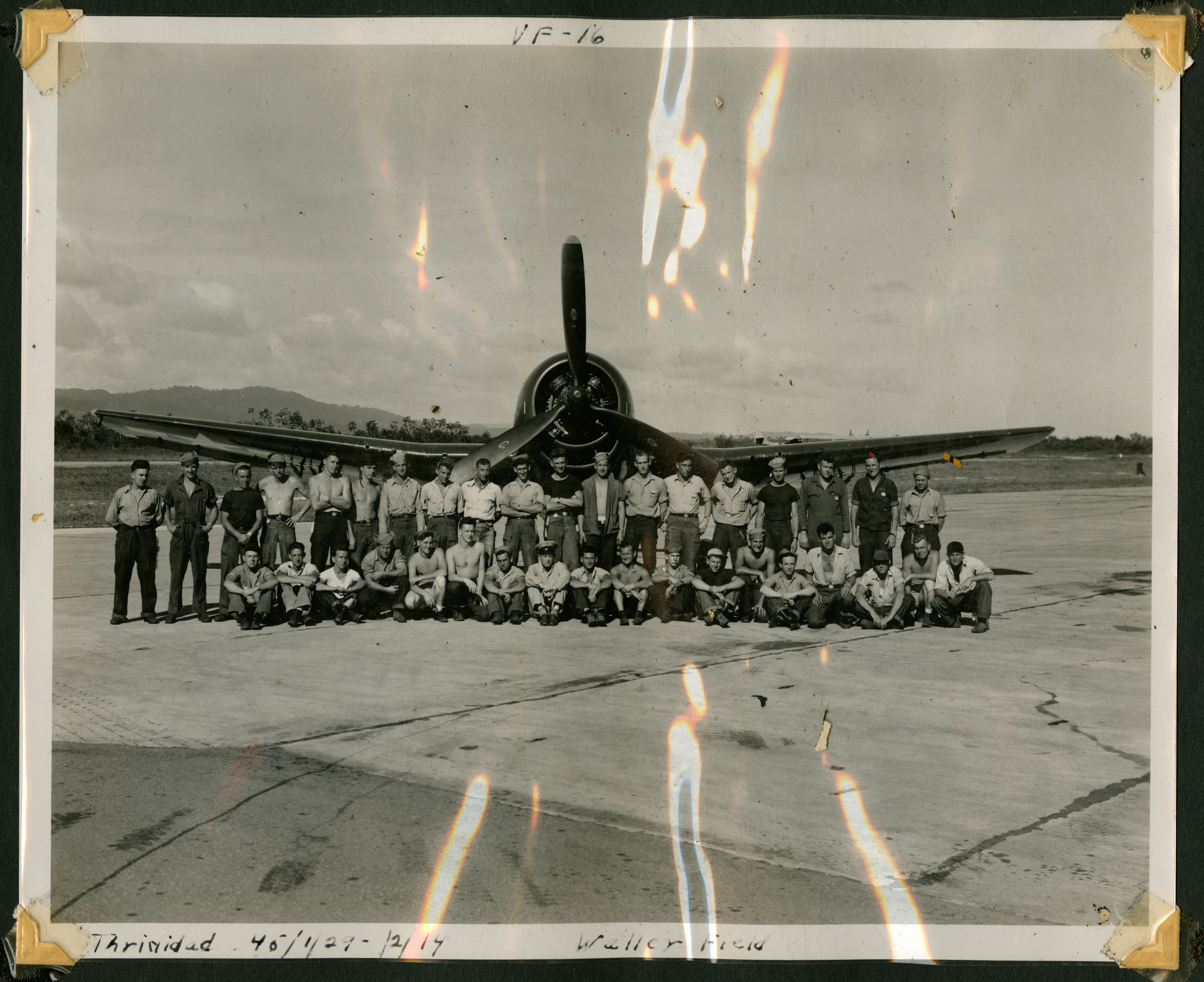 A large photograph of a group of young servicemen in front of an airplane. The photograph is labeled "VF-16," and the bottom is labeled, "Thrinidad [sic] 46/1/29 - /2/14 Waller Field"