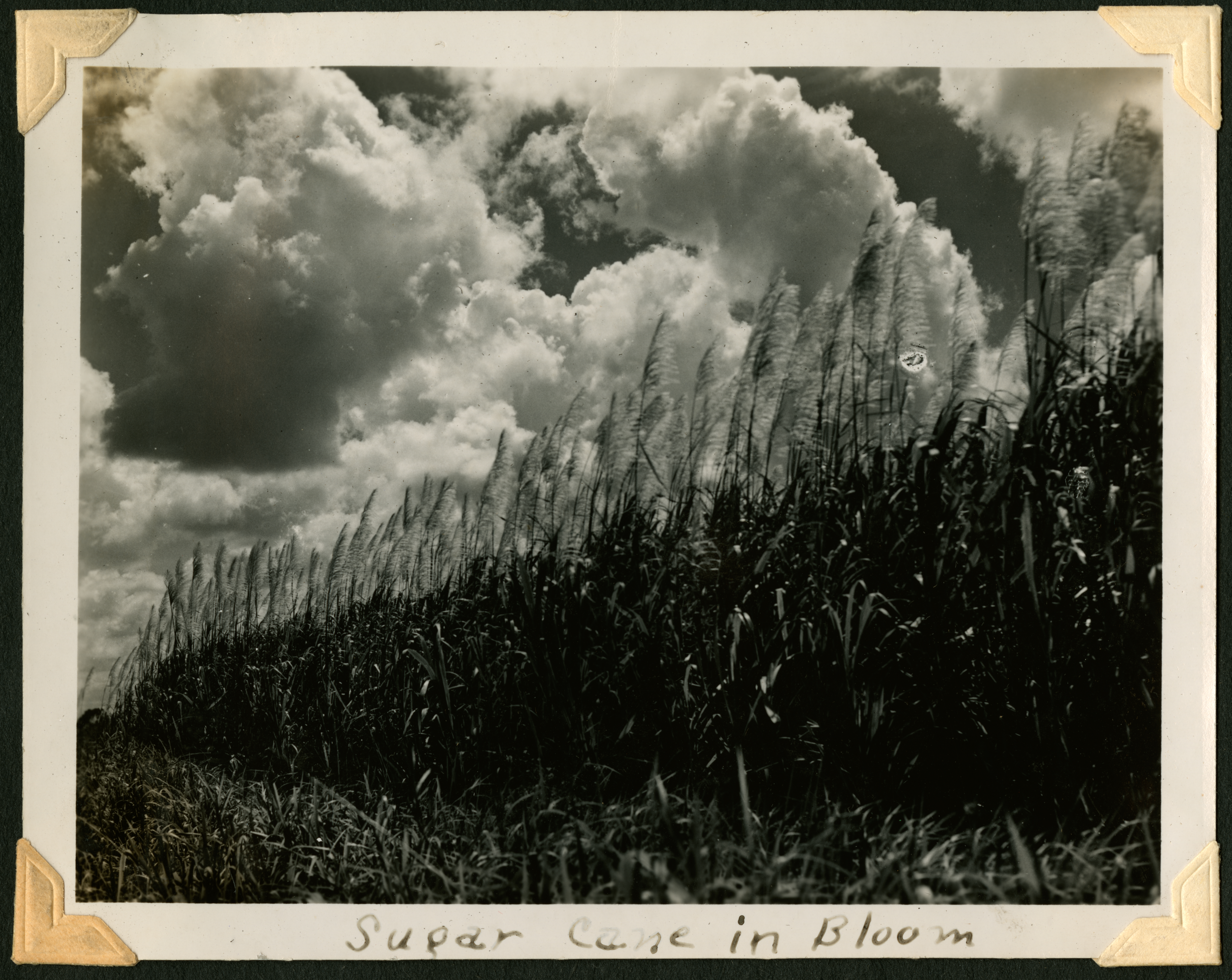 The image is of the edge of a field of crops, with a cloudy sky in the background. On the bottom margin of the photo, in pen, is "Sugar Cane in Bloom." Written in pencil, in cursive, on the center back of the photo is "Sugar cane in bloom."