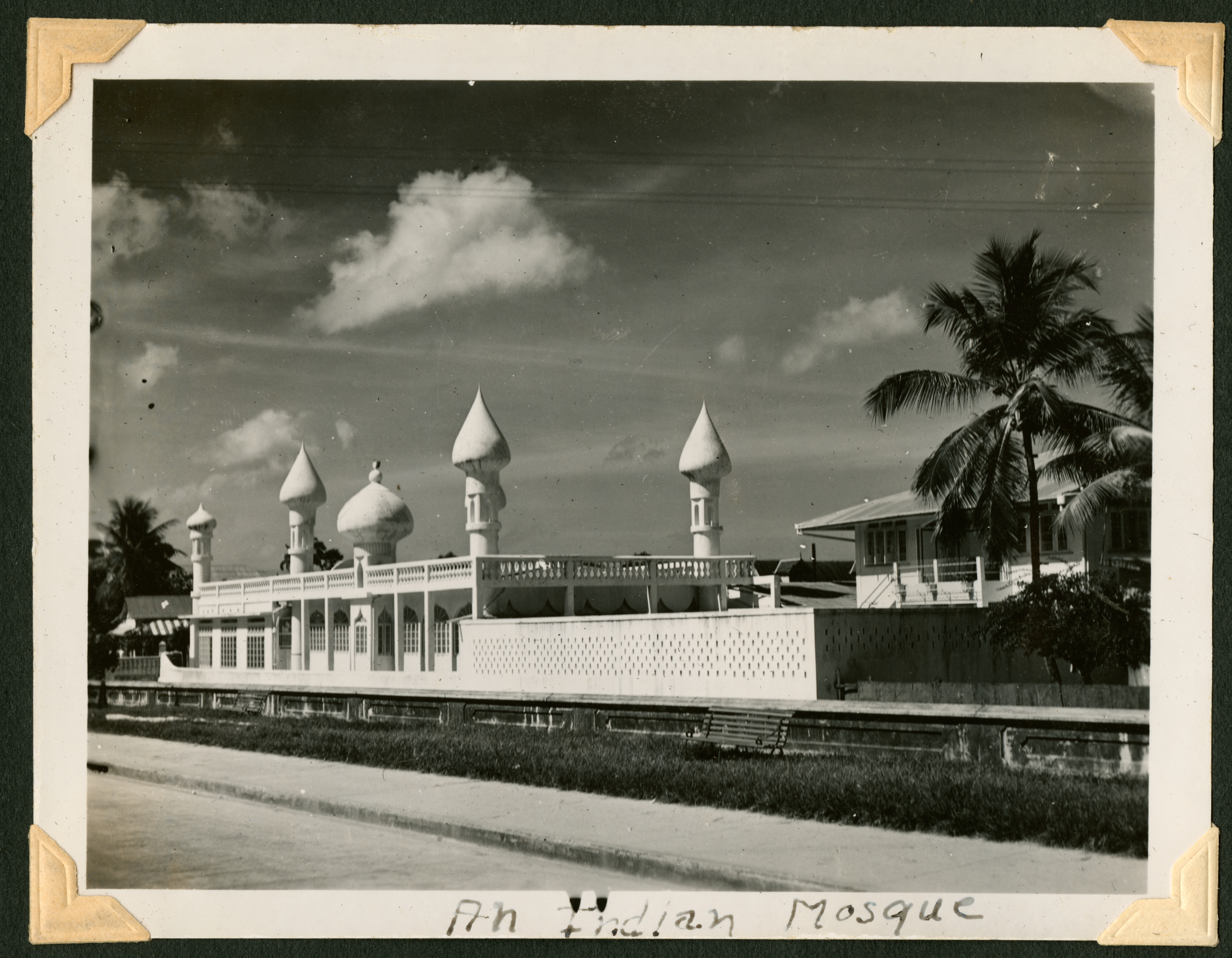 The image is of a grand white building, with a fence, and with several onion-shaped domes on towers (presumably minarets) seen rising above the rest of the structure. There is what appears to be a house to the right of the centered building, with palm trees and grass seen along the street out front. There appear to be telephone wires seen faintly against the sky near the top of the image. On the bottom margin of the image, in pen, is "An Indian Mosque." Written in pencil, in cursive, on the center back of the photo is "An Indian Mosque." Due to the long history of colonization and slavery in Trinidad, Islam became a minority religion as it was brought over by enslaved Africans.
