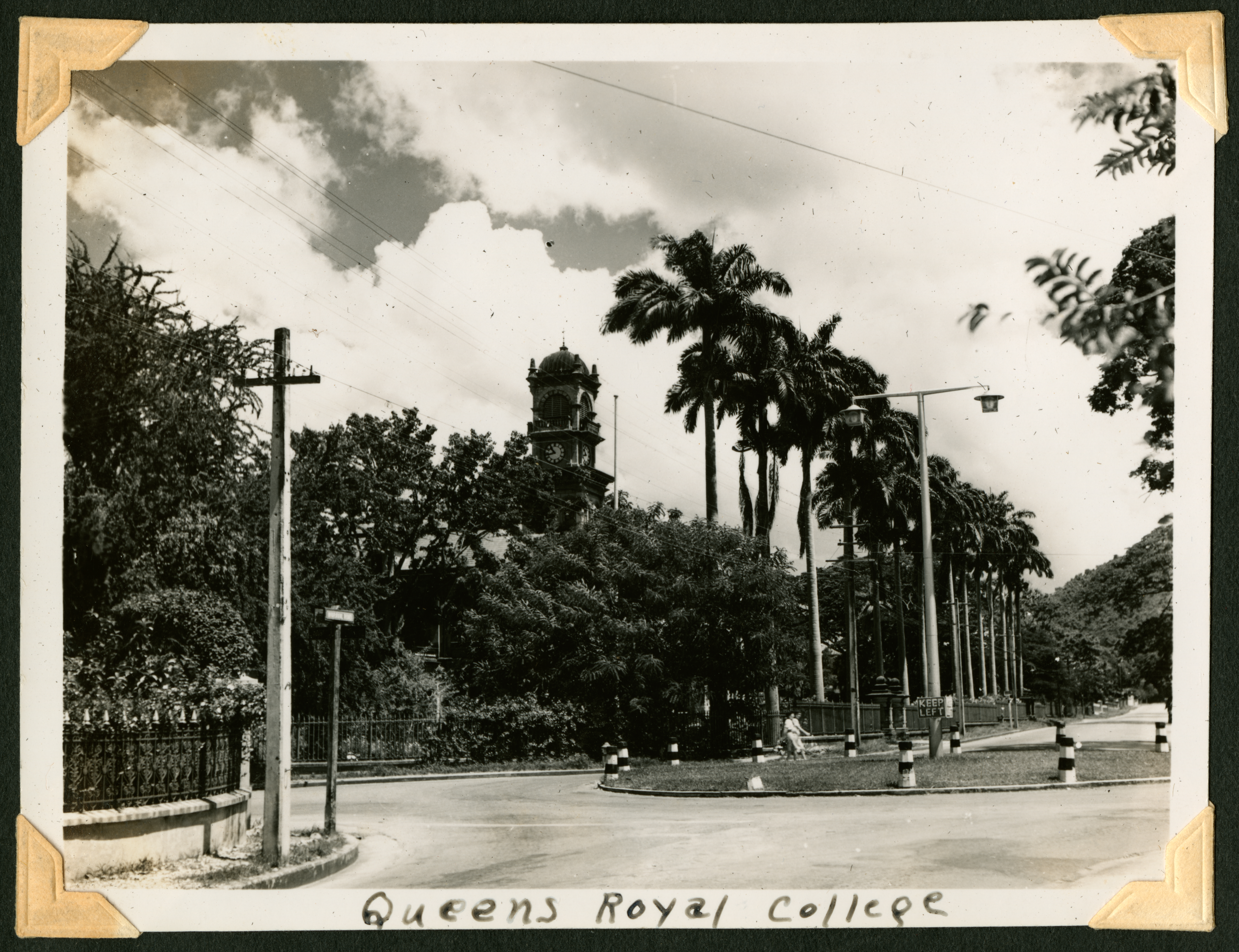 The image shows what appears to be a roundabout street, with telephone wires, lampposts, and a sign in the middle of the round with the words "Keep left" on it. Along the streets is a fence with trees and vegetation behind it. A few people can be seen walking in the background. There is a clock tower above the edge of the trees in the center background. On the bottom margin of the image, in pen, is "Queens Royal College." Written in pencil, in cursive, on the center back of the photo is "Queens Royal College."