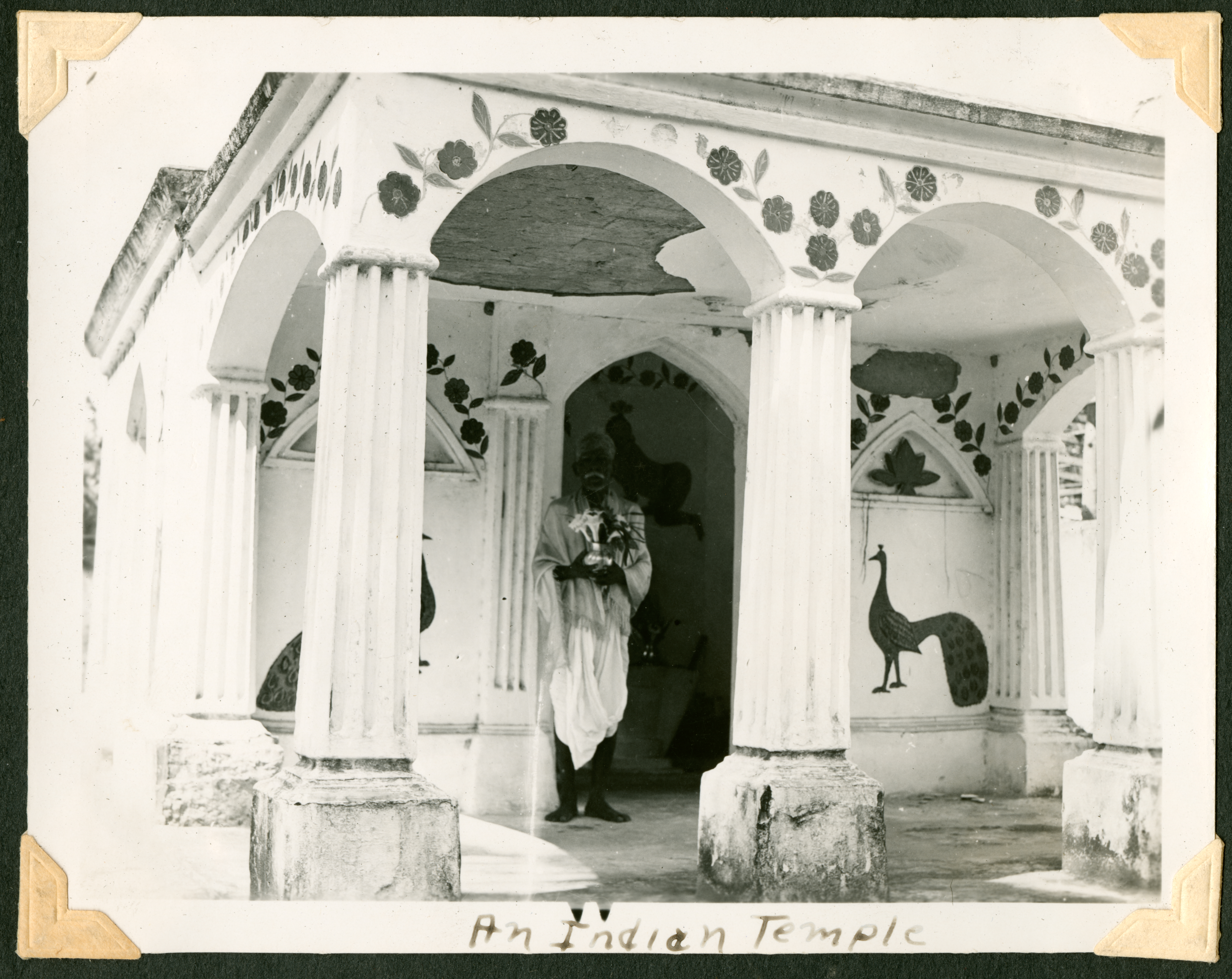 The image is of the same building and man shown in CPL-UKLEJA-scrapbook-017-02. This photo shows the porch of the building, with stone columns framing it. There is a flower pattern along the archways between columns and around the relief sculptures. The man in the white robe stands in front of the opening doorway into the rest of building, where more paintings can be seen. He is holding more flowers and is barefoot. On the bottom margin of the image, in pen, is "An Indian Temple." Written in pencil, in cursive, on the center back of the photo is the number ten and "An Indian Temple."