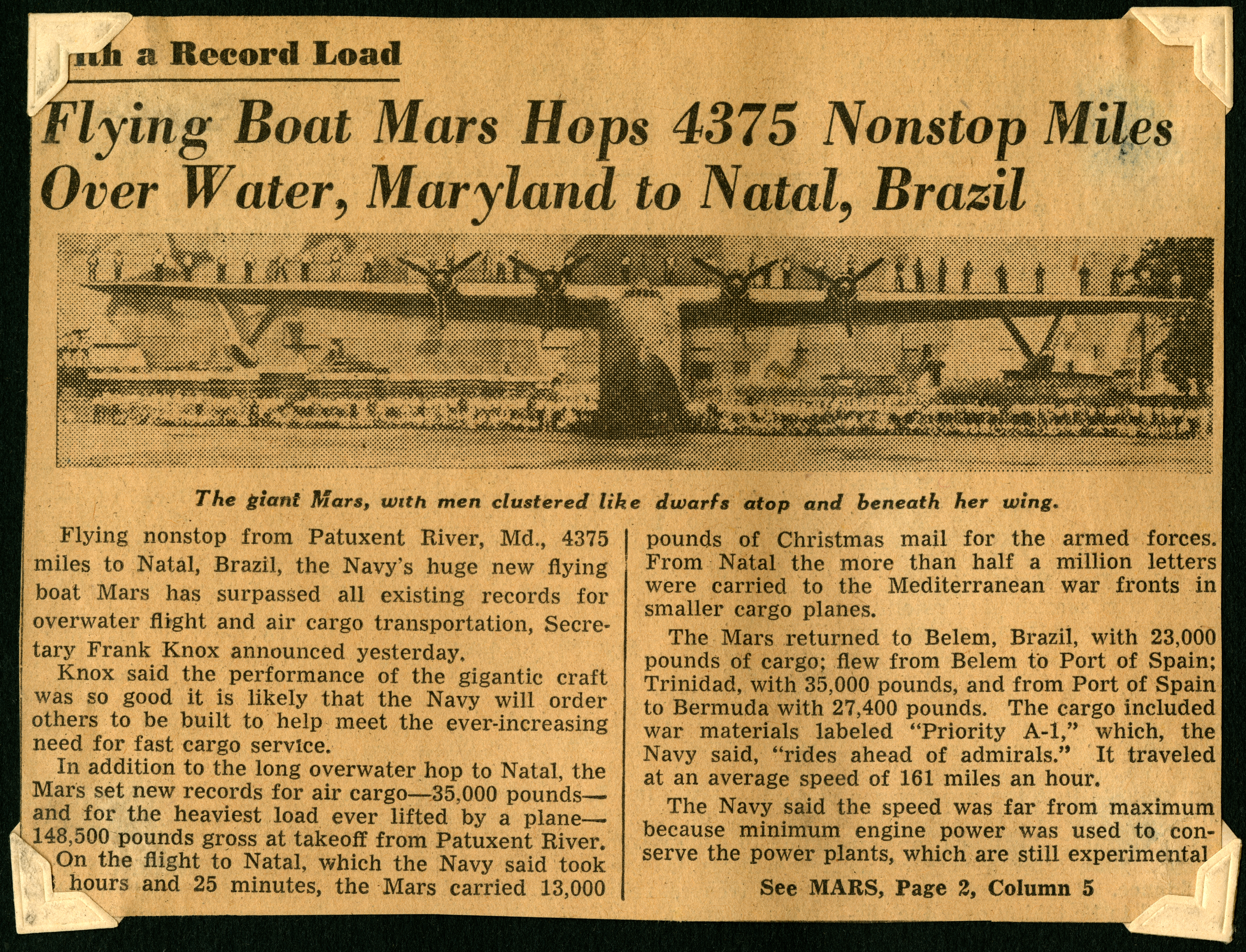 In the top corner of the clipping, it reads "With a Record Load." Below that is the byline, "Flying Boat Mars Hops 4375 Nonstop Miles Over Water, Maryland to Natal, Brazil." Below that is a banner image of a large aircraft with what appears to be a crowd of people below its wings. The picture is captioned, "The giant Mars, with men clustered like dwarfs atop and beneath her wing." In two columns of text reads the story: "Flying nonstop from Patuxent River, Md., 4375 miles to Natal, Brazil, the Navy's huge new flying boat Mars has surpassed all existing records for overwater flight and air cargo transportation, Secretary Frank Knox announced yesterday. Knox said the performance of the gigantic craft was so good it is likely that the Navy will order others to be buit to help meet the ever-increasing need for fast cargo service. In addition to the long overwater hop to Natal, the Mars set new records for air cargo--35,000 pounds---and for the heaviest load ever lifted by a plane--148,500 pounds gross at takeoff from Patuxent River. On the flight to Natal, which the Navy said took 28 hours and 25 minutes, the Mars carried 13,000 pounds of Chirstmas mail for the armed forces. From Natal the more than half a million letters were carried to the Mediterranean war fronts in smaller cargo planes. The Mars returned to Belem, Brazil, with 23,000 pounds of cargo; flew from Belem to Port of Spain; Trinidad, with 35,000 pounds, and from Port of Spain to Bermuda with 27,400 pounds. The cargo included war materials labeled 'Priority A-1,' which, the Navy said, 'rides ahead of admirals.' It traveled at an average speed of 161 miles an hour. The Navy said the speed was far from maximum because minimum engine power was used to conserve the power plants, which are still experimental."