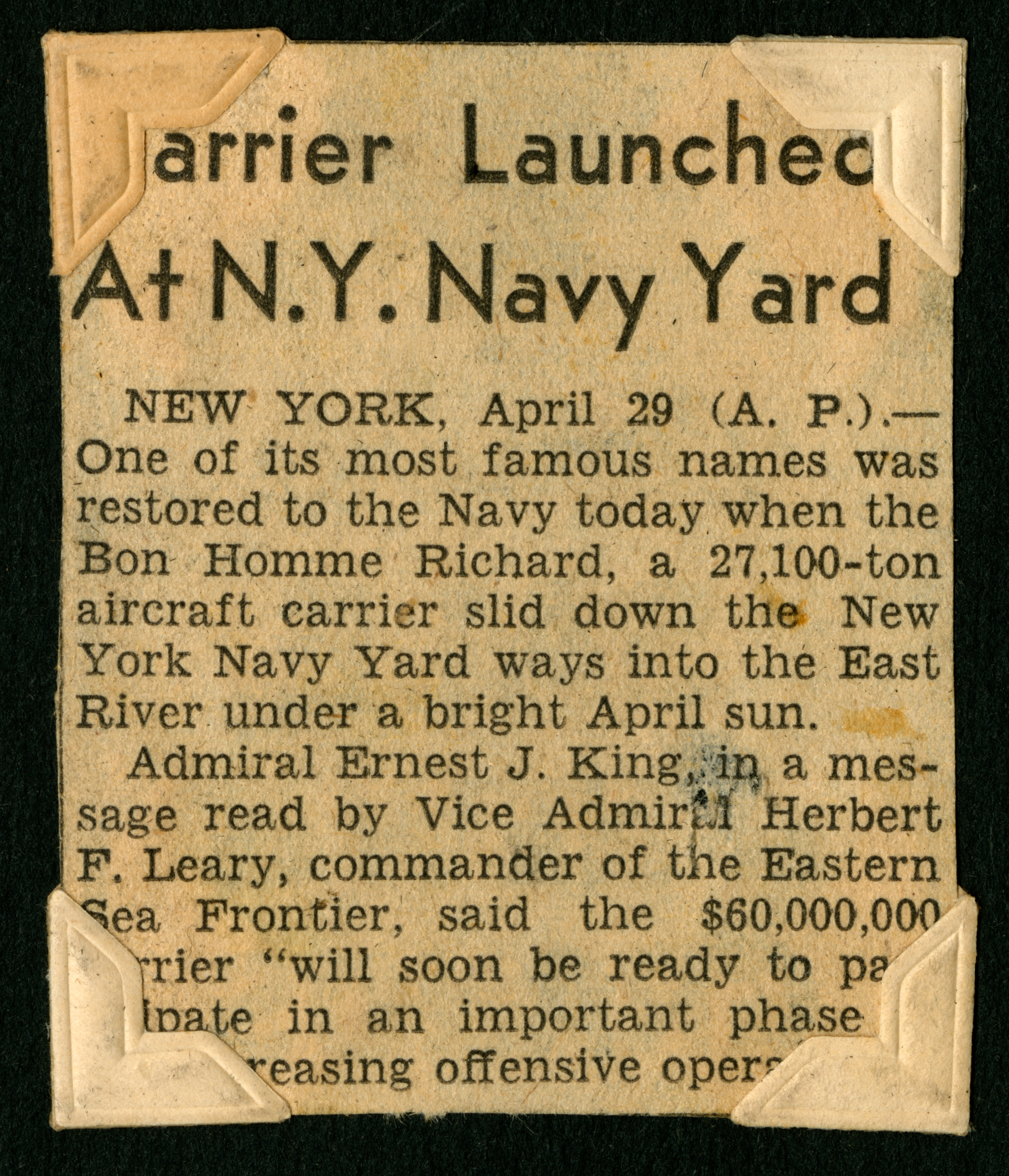The title at the top of the clipping is "Carrier Launched At N.Y. Navy Yard" with the text below it reading, "NEW YORK, April 29 (A. P.).--One of its most famous names was restored to the Navy today when the Bon Homme Richard, a 27,100-ton aircraft carrier slid down the New York Navy Yard ways into the East River under a bright April sun./Admiral Ernest J. King, in a message read by Vice Admiral Herbert F. Leary, commander of the Eastern Sea Frontier, said the $60,000,000 carrier 'will soon be ready to participate in an important phase of our increasing offensive operations.'"