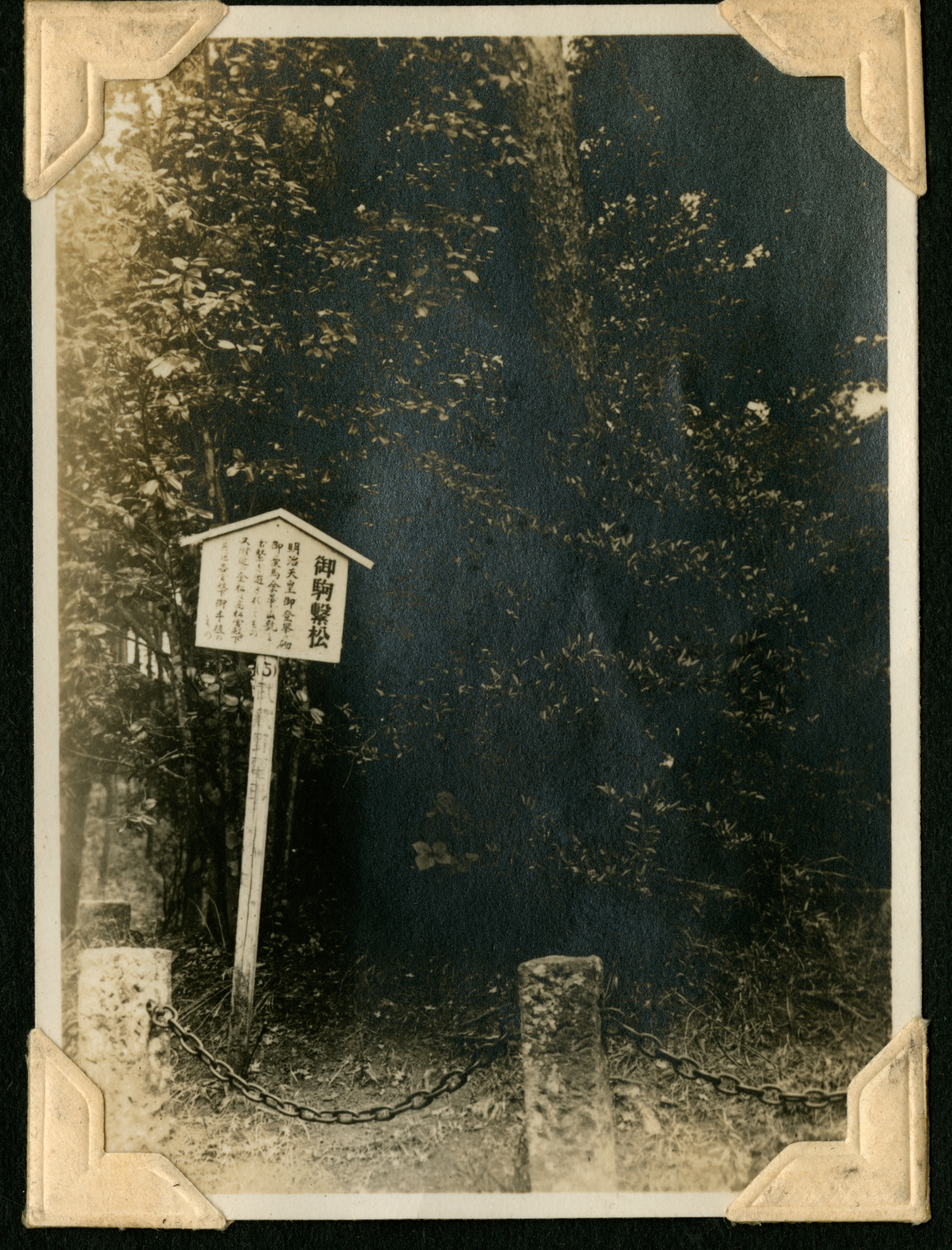A photograph of a wooded area with a sign with Japanese characters written on it to the left of the image. There are posts with a chain connecting them as a fence in the foreground in front of the sign. Most of the sign is indecipherable; however, part of it translates to "Emperor Meiji." Some of the other characters seem to be telling the story of the rock seen to the left of the sign, which suggests these trees are the "horse-hitching pine" to which shogun Minamoto no Yoritomo once hitched his horse in the twelfth century and/or the story of Emperor Meiji later visiting the site.