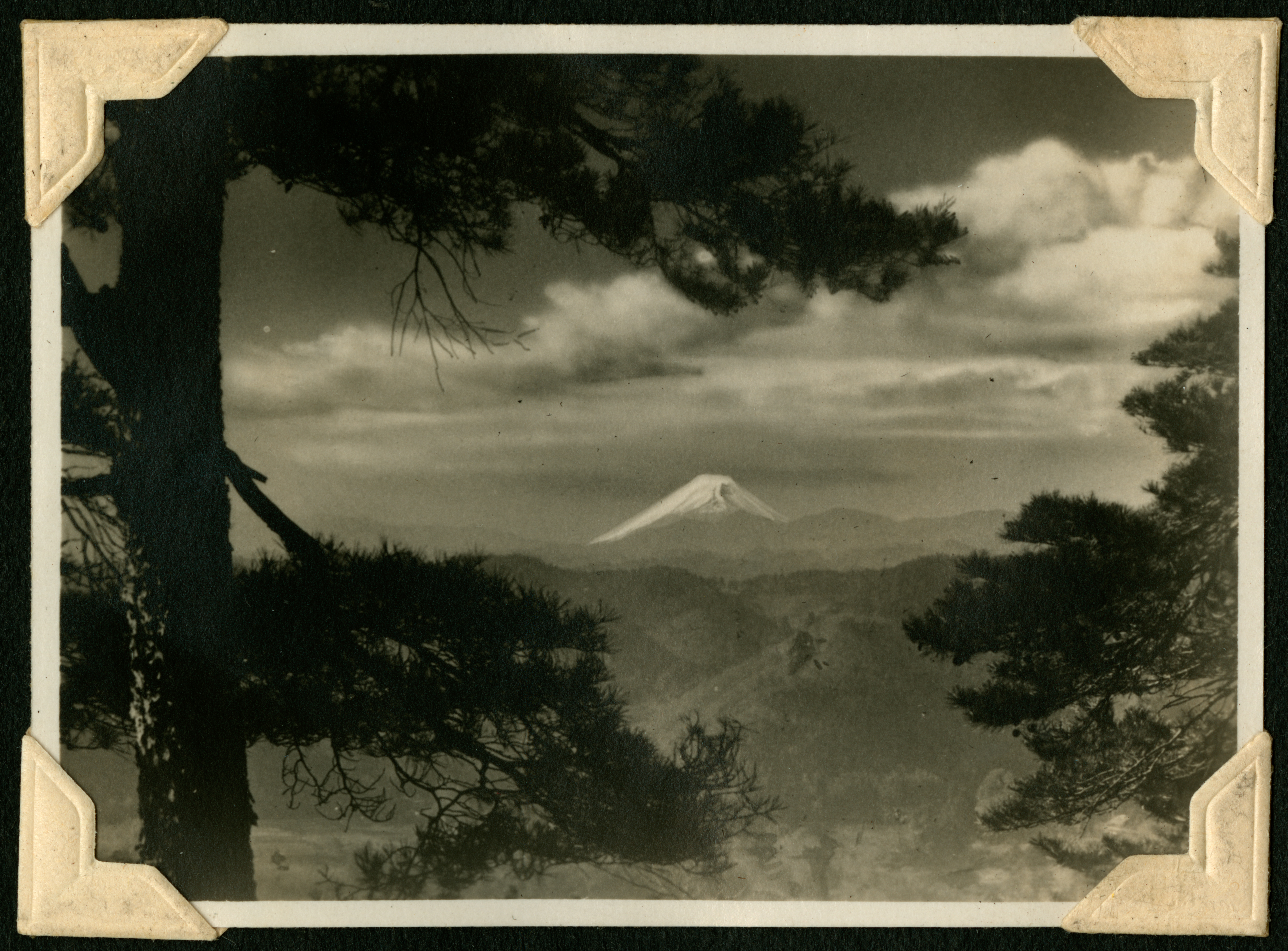 A photo of a snow capped mountain in the distance. There are trees in the foreground and what seem like hills in the middle ground. Based on the memorabilia from the previous page, this mountain is Mt. Fuji, which can be seen on clear days from Mt. Tenran.