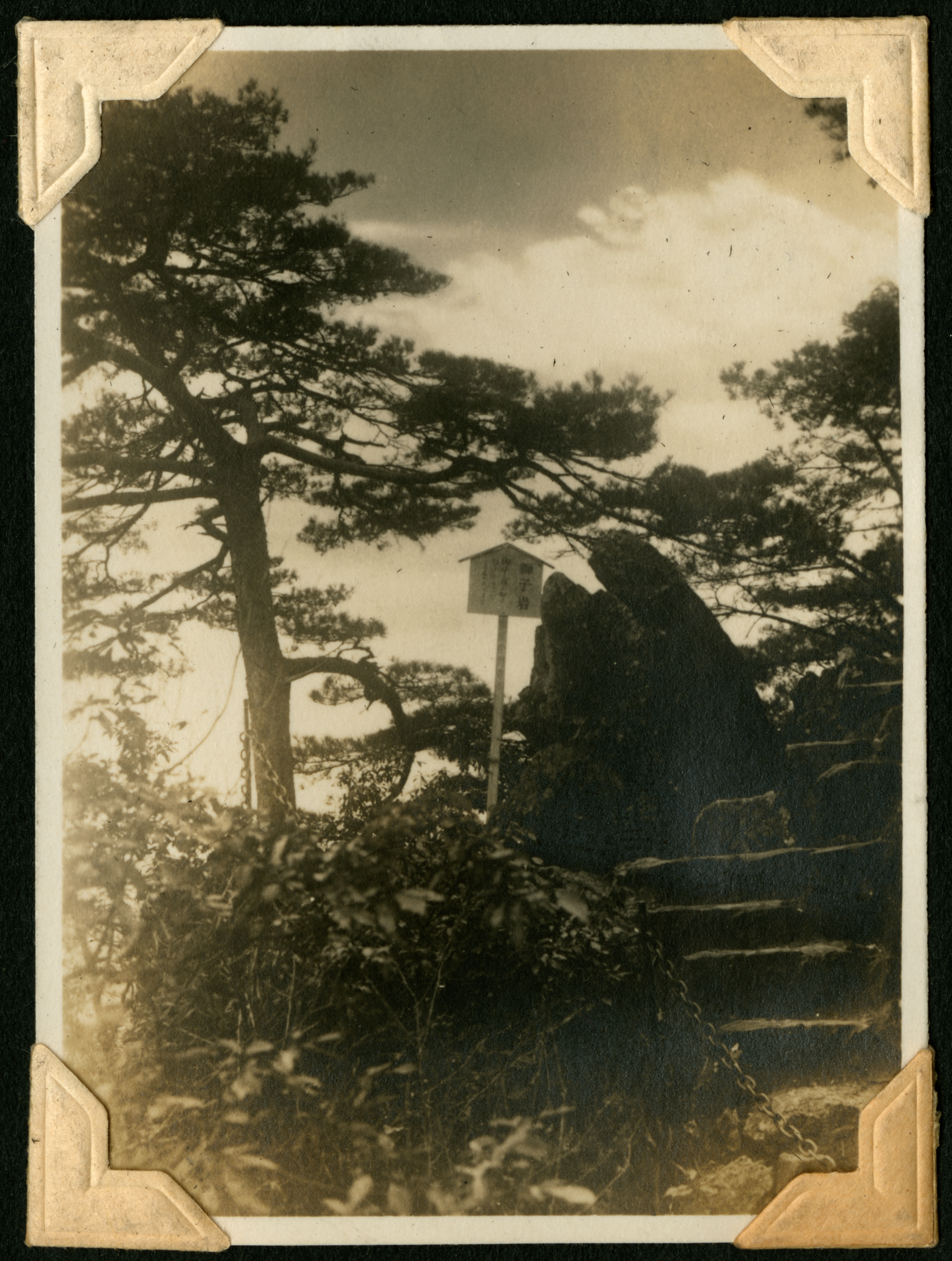 A photograph of an outdoor path with stone steps and a cropping of rocks, with a sign with Japanese text that translates to "Lion's rock."