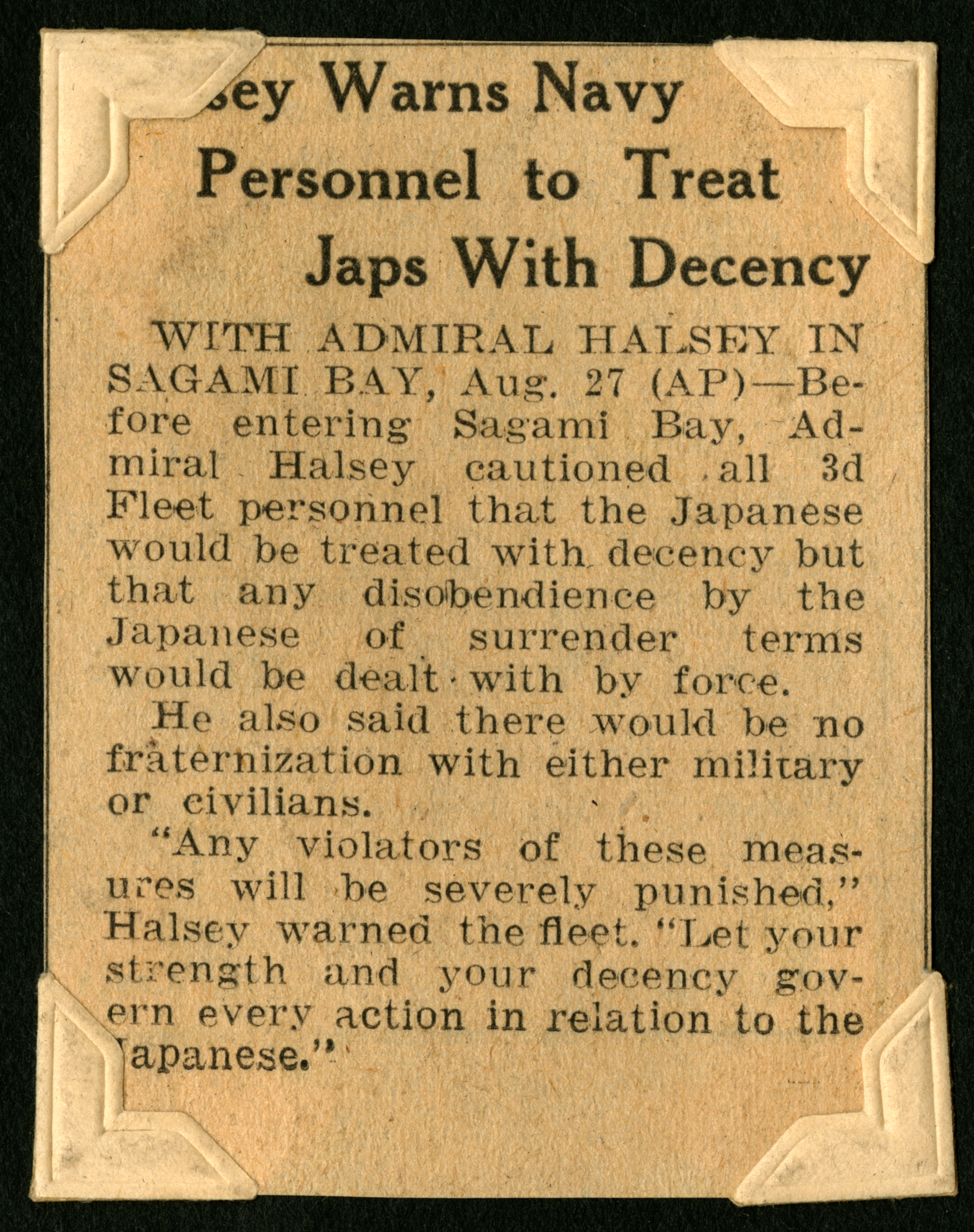 The headline of the clipping at the top reads, "Halsey Warns Navy Personnel to Treat Japs with Decency." The text reads, "WITH ADMIRAL HALSEY IN SAGAMI BAY, Aug. 27 (AP)--Before entering Sagami Bay, Admiral Halsey cautioned all 3d Fleet personnel that the Japanese would be treated with decency but any disobedience by the Japanese of surrender terms would be dealt with by force. HE also said there would be no fraternization with either military or civilians. 'Any violators of these measures will be severely punished,' Halsey warned the fleet. 'Let your strength and your decency govern every action in retaliation to the Japanese.'"