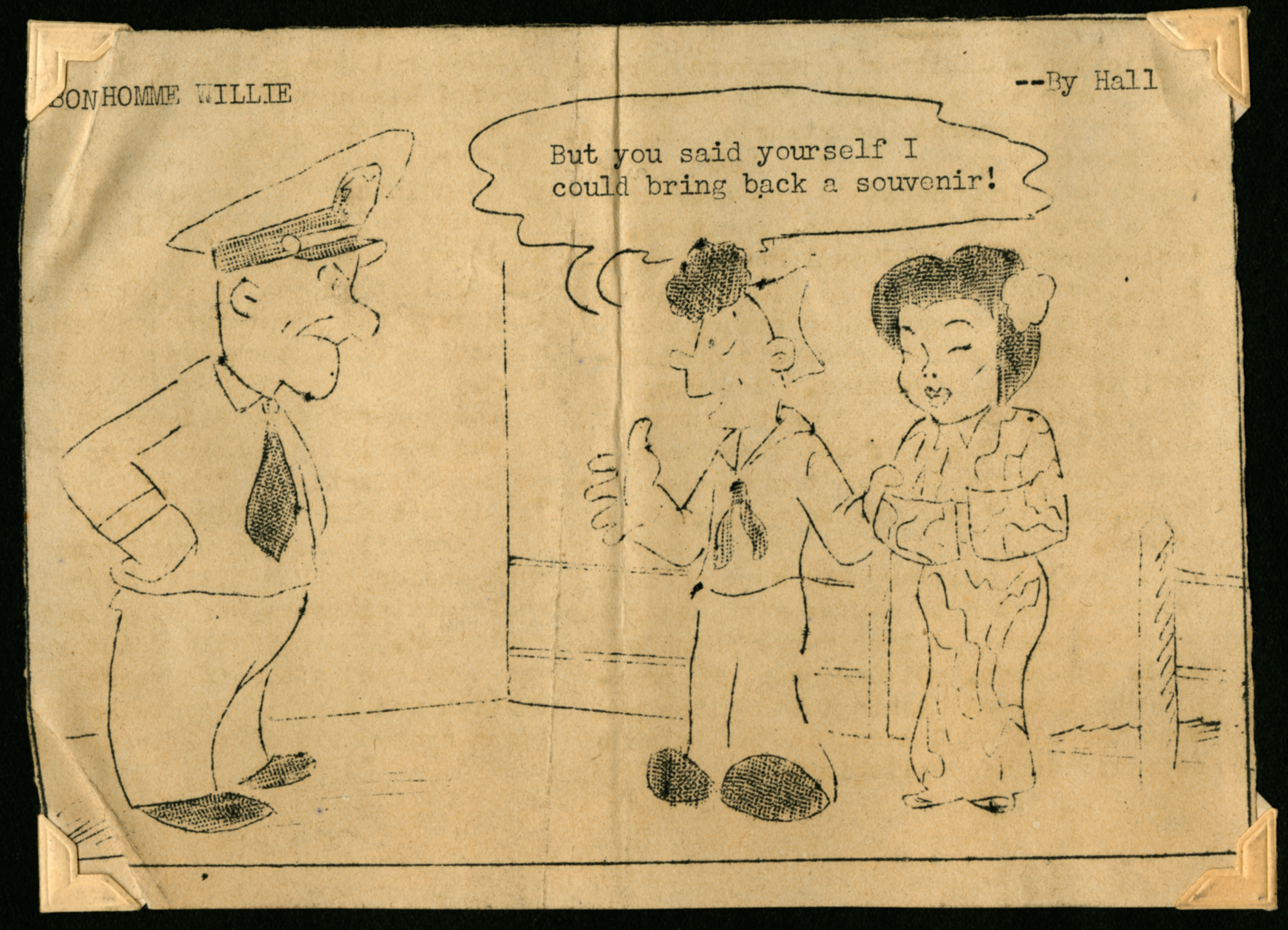 This is a cartoon depicting contemporary attitudes on American servicemen having sex with Japanese women and/or attempting to bring them to the U.S. as wives. The title of the cartoon is "Bon Homme Willie," and the author is listed in the top right corner with a note, "--By Hall." To the left of the cartoon stands a stern man, frowning in profile with hands on his hips and in an officer's hat. He is looking at a young naval serviceman in uniform holding onto a woman in a kimono. The young man has a text bubble above him that says, "But you said yourself I could bring back a souvenir!" The woman is drawn as a racial caricature, reflective of broad American views of Japanese people--and especially women--at the time, recognized now as racist and offensive.