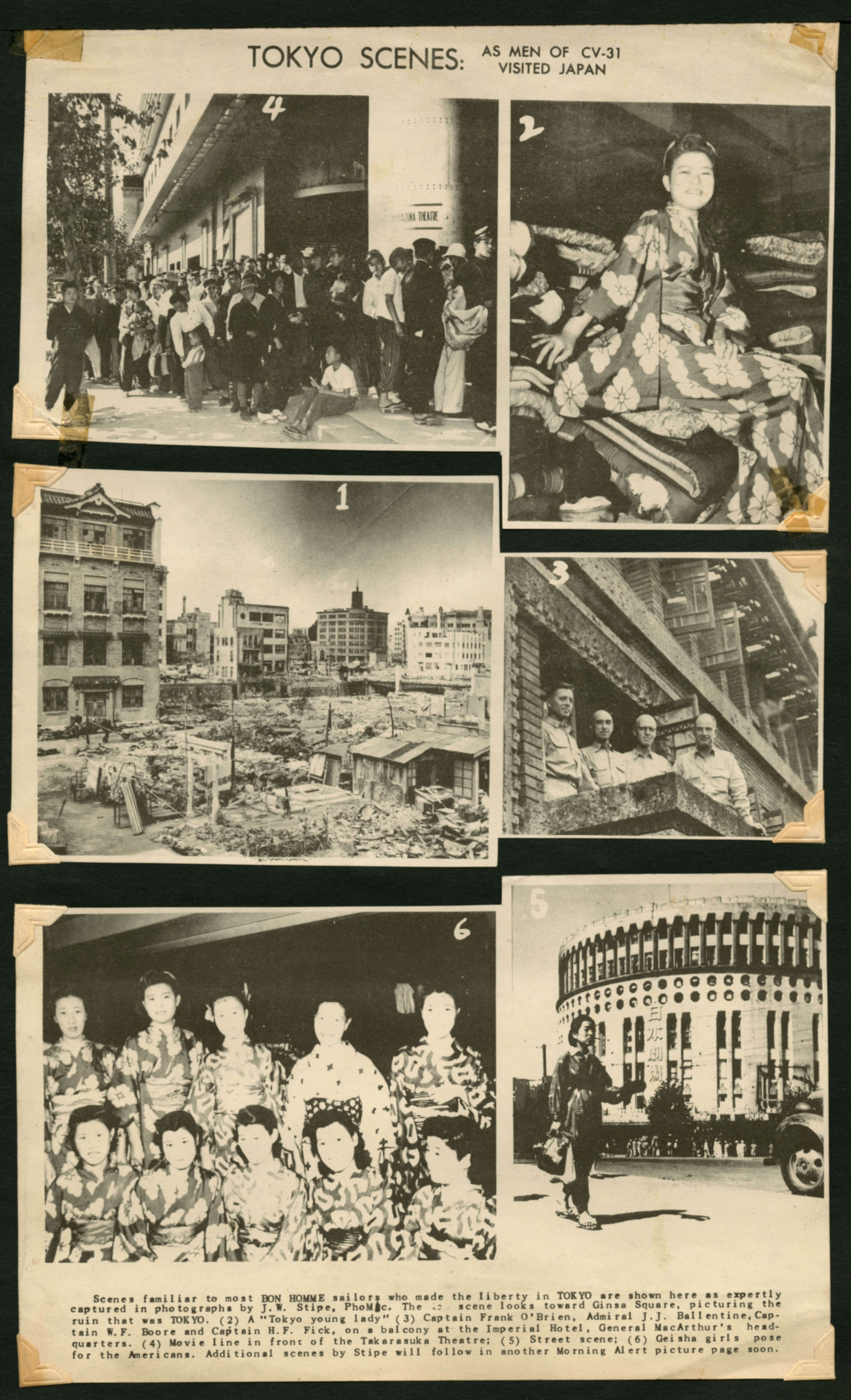A series of newspaper clippings taken from the same article/feature. Titled "Tokyo Scenes: As Men of CV-31 Visited Japan"