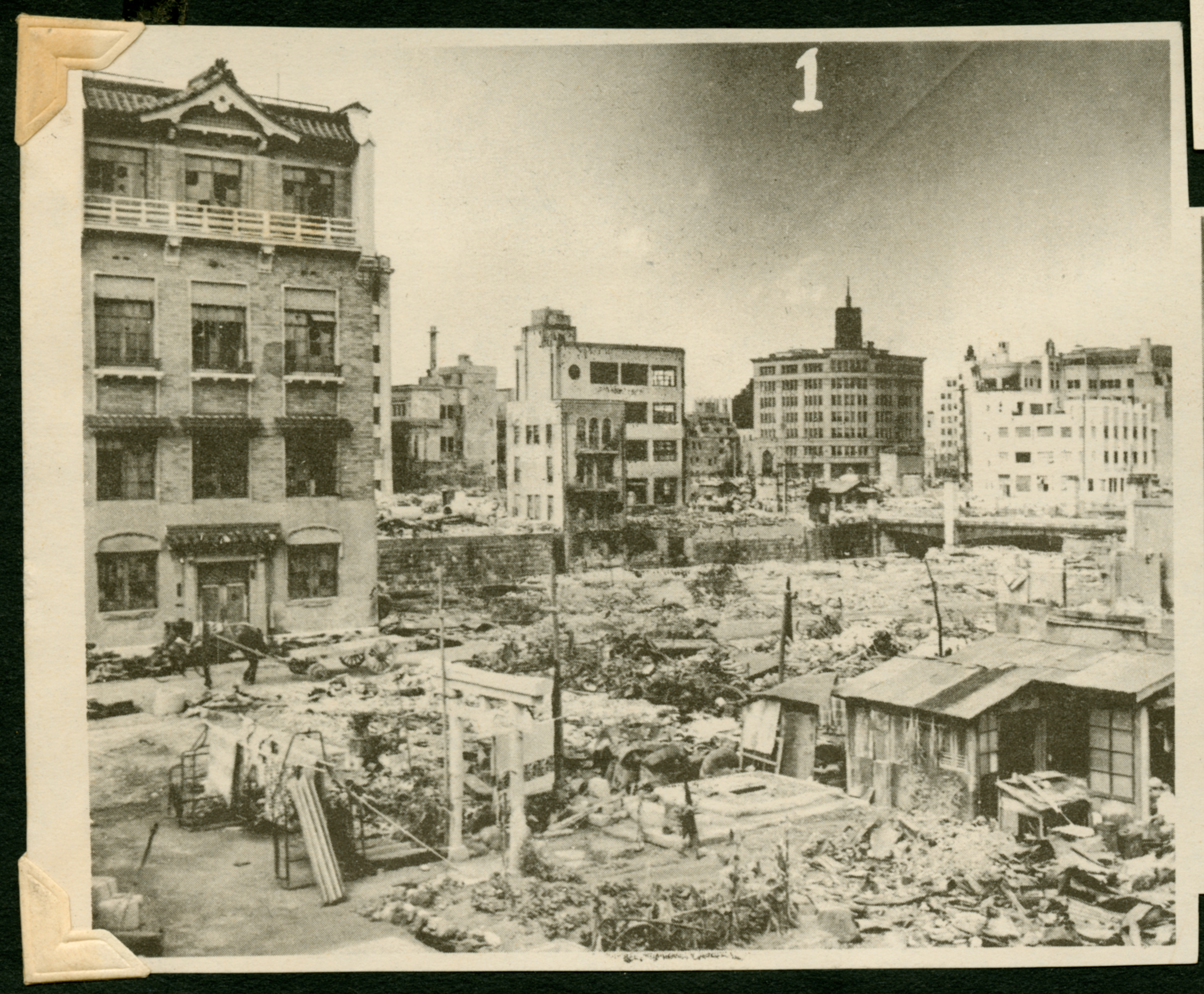 A newsprint photo of Ginsa Square in Tokyo, now ruined.