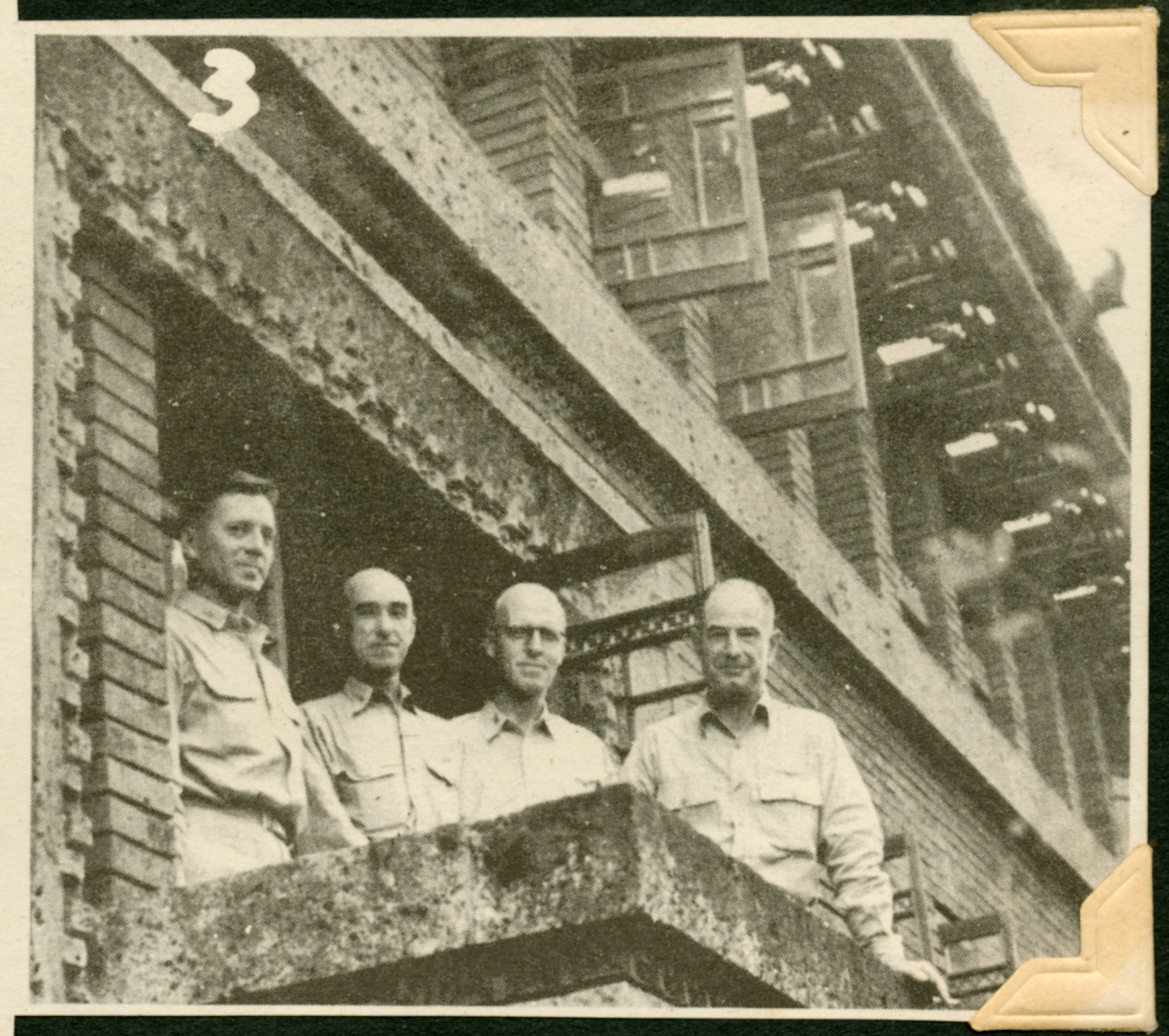 The picture is labeled with a 3 at the top left corner in white. The image shows four men in uniform standing on a balcony of a building, looking down at the camera. The caption at the end of the article (not pictured here) identifies them as Captain Frank O'Brien, Admiral J.J. Ballentine, Captain W.F. Boore, and Captain H.F. Fick, and the hotel as the Imperial Hotel, which served as MacArthur's headquarters.