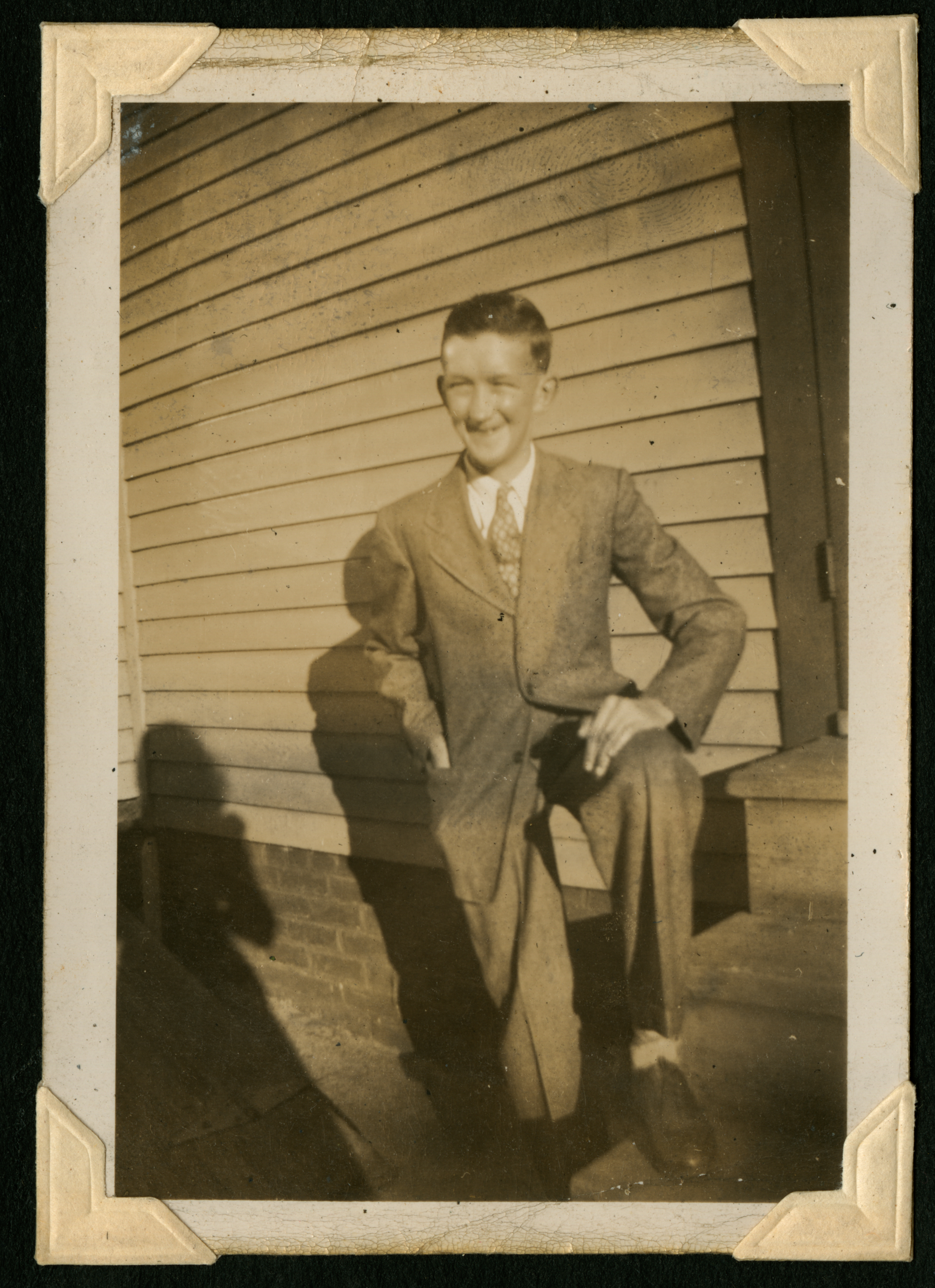 The photo shows a young man in a suit standing outside a house with one foot on the step. He is smiling at the camera. 042 is printed on the back of the photo in black ink.