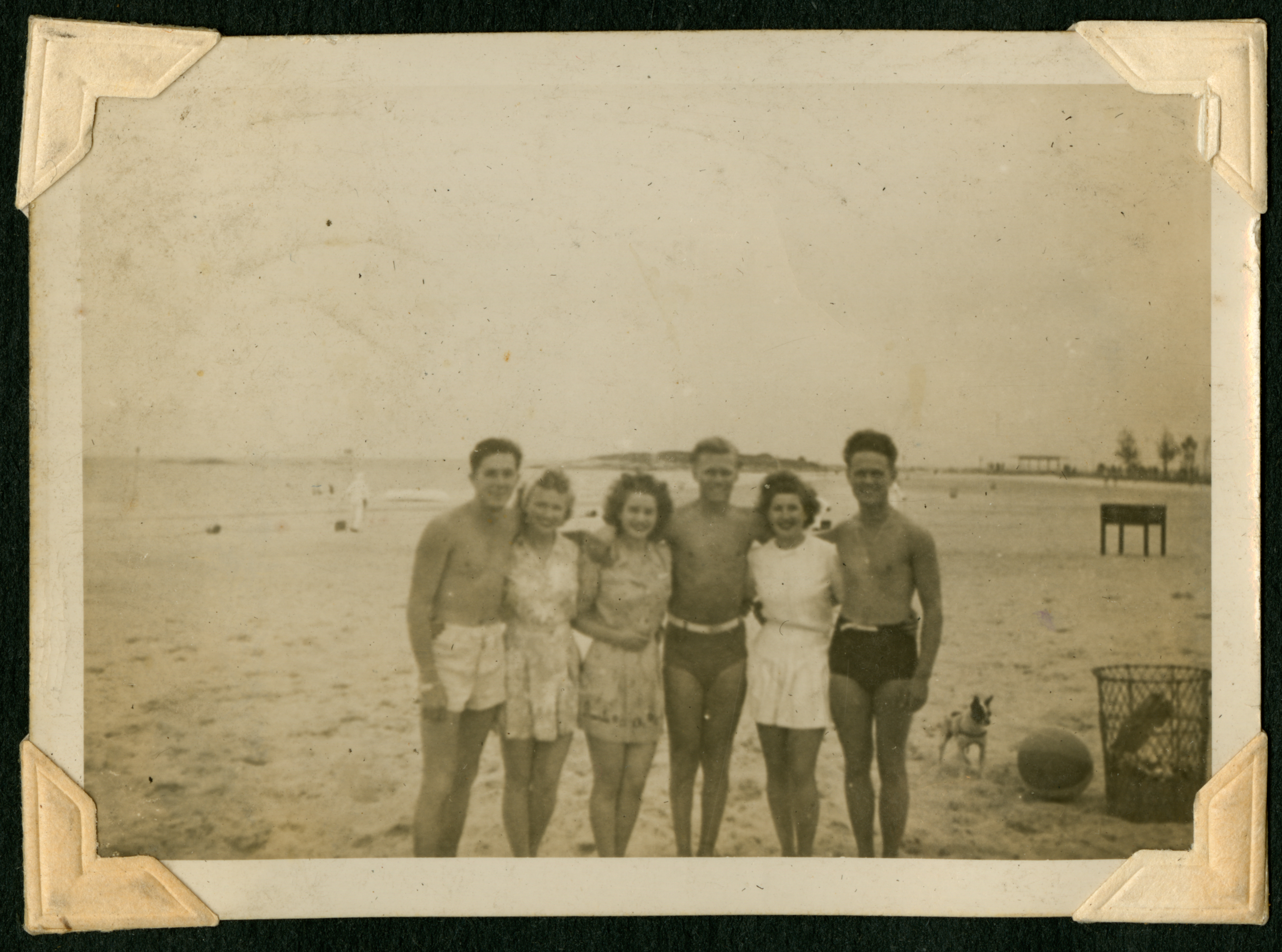 A group of six young adults on a mostly-empty beach wih a dog, a ball, and a traschan in the background. (L-R) Standing arm and arm is a shirtless young man in swimming shorts, a young woman in a short swim dress, another young woman in a short swimdress, a shirtless young man in swimming shorts, a young woman in a short swim dress, and another shirtless young man in swimming shorts.