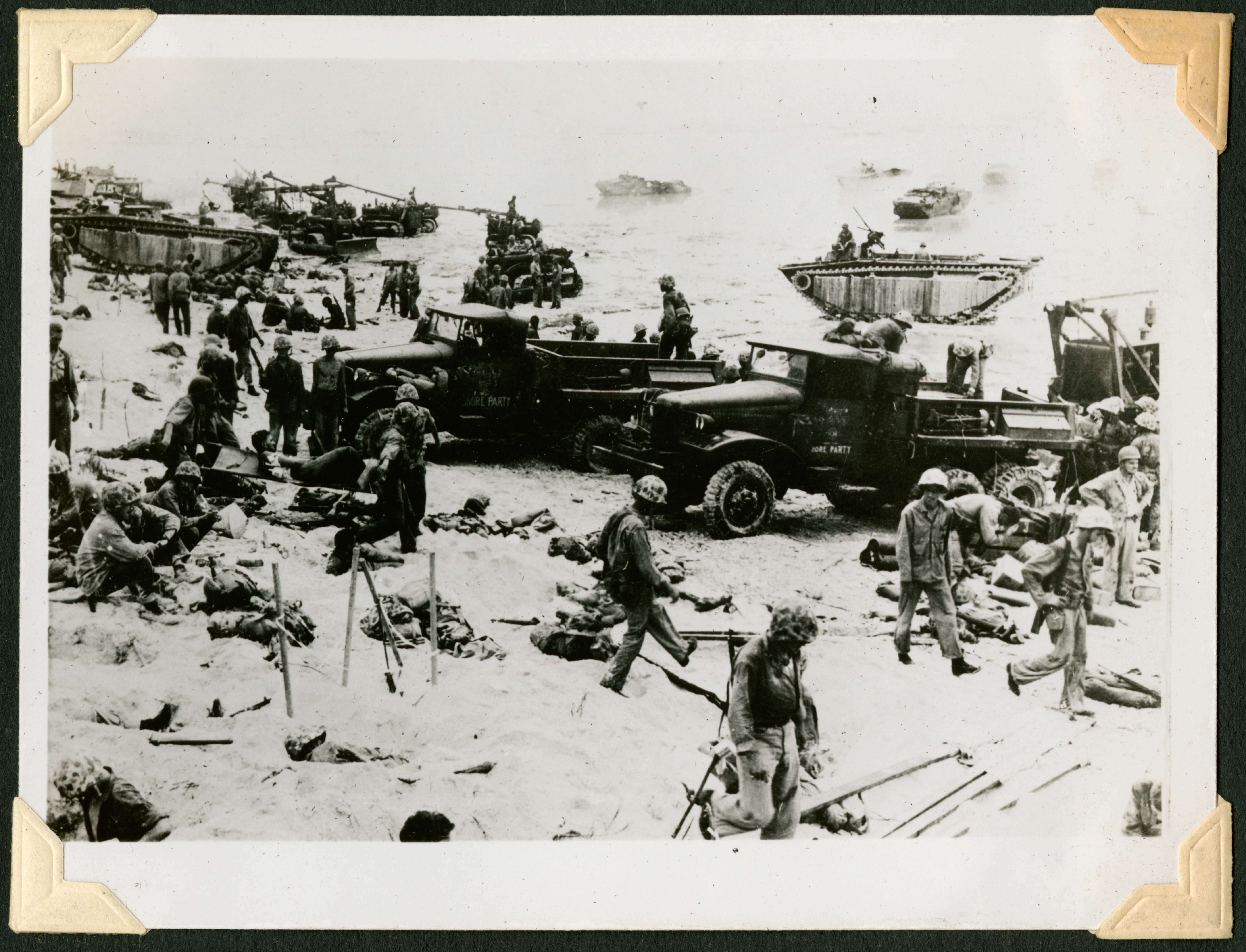 The image is of a beach where trucks, tanks, and other military vehicles are being deployed. The beach is full of servicemen walking and sitting around, with several bags and other supplies strewn about. 53 is printed in black ink on the back of the photograph.