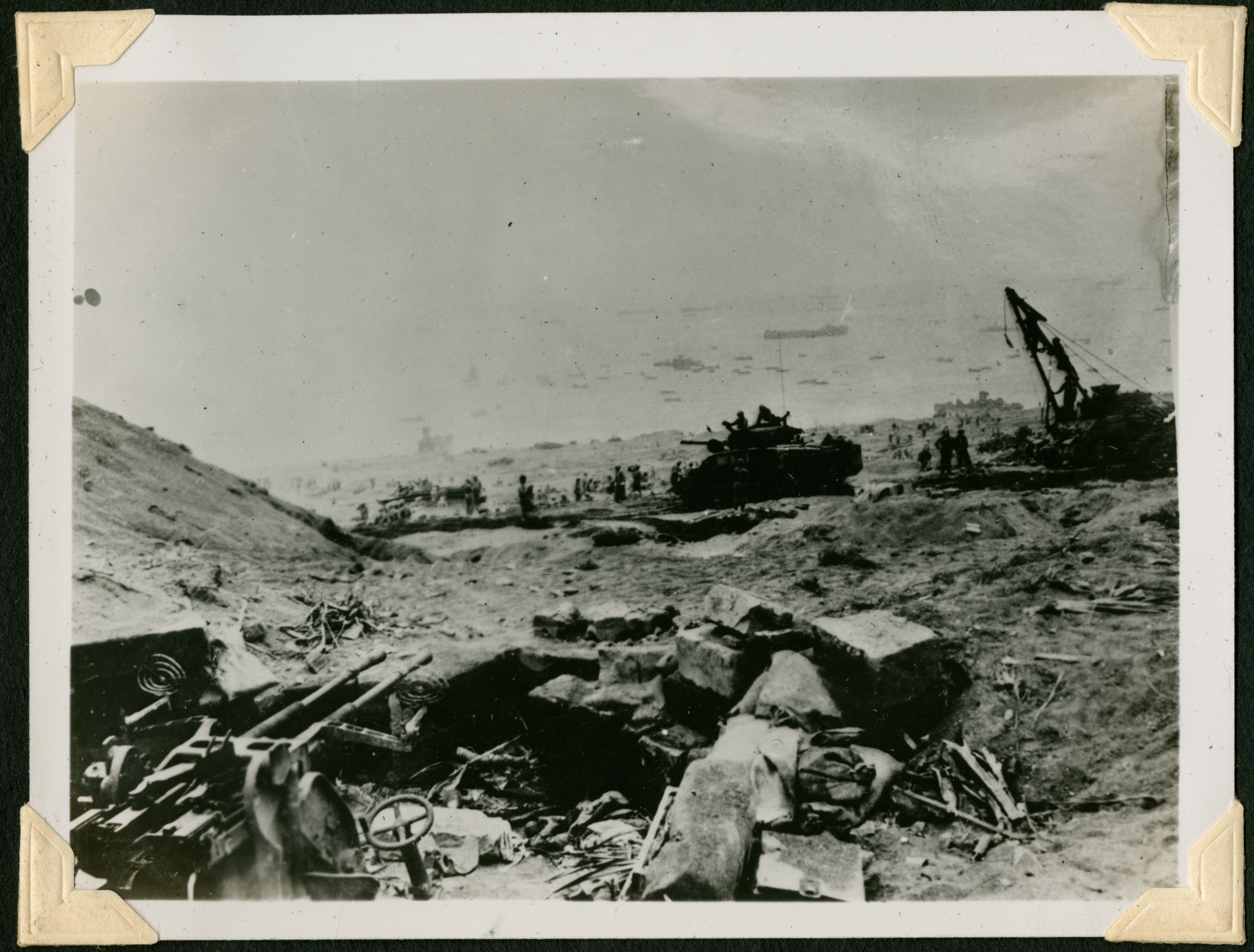 The image shows a battlefield full of empty earth and some debris. Soldiers can be seen throughout the image, and there are a few tanks in the middleground. 53 is printed in black ink on the back of the photograph.