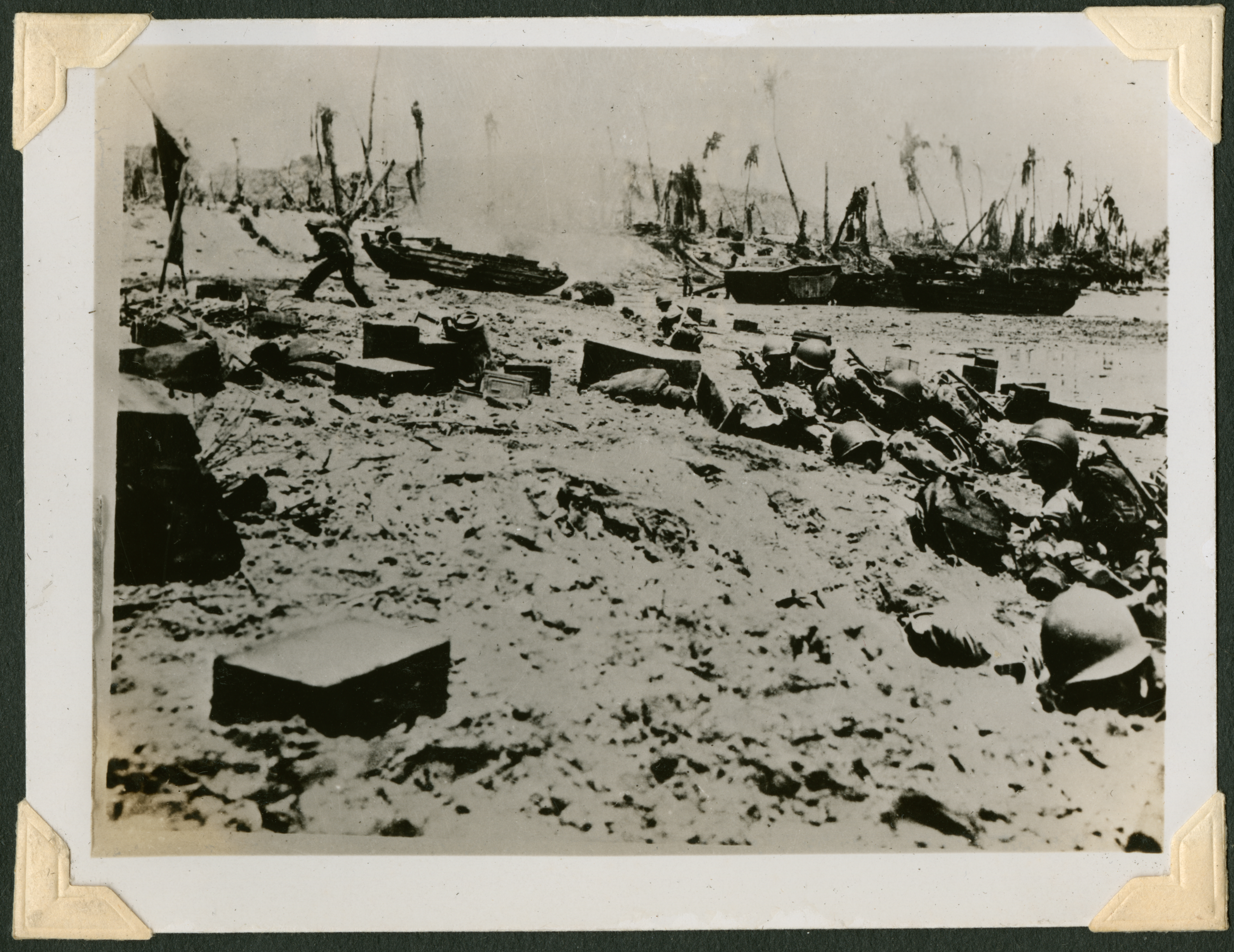 The image is of a battleground, strewn with debris. The trunks of trees can be seen throughout the background of the image, as well as some vehicles (it is unclear if they are cars, boats, or something else). A group of soldiers are in the foreground, laying on the sloped earth with guns pointing up. 53 is printed in black ink on the back of the photograph.