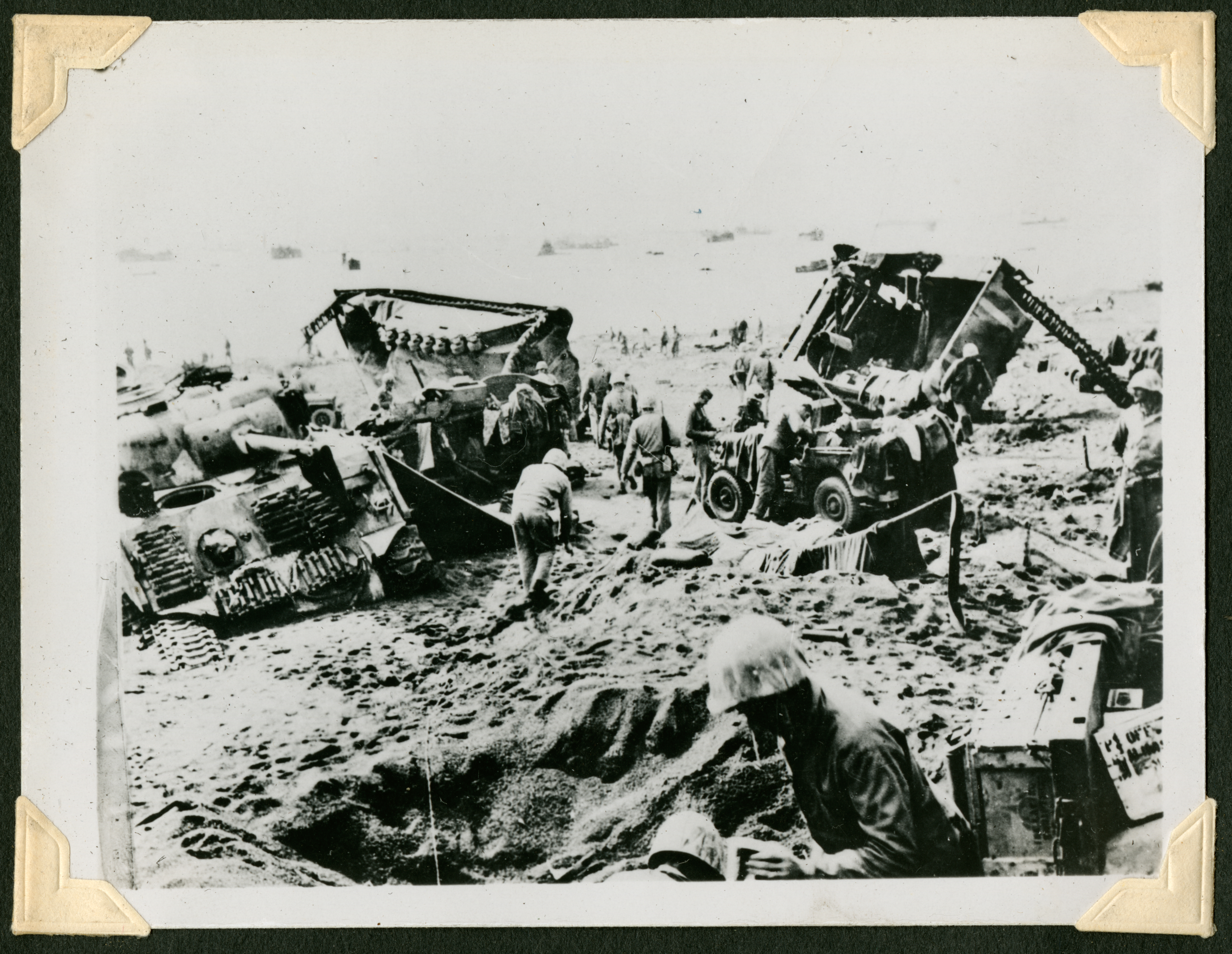 The image is of a battlefield with various soldiers crouched or walking. There are a few vehicles (tanks, trucks) that appear to be unloading cargo. 53 is printed in black ink on the back of the photograph.