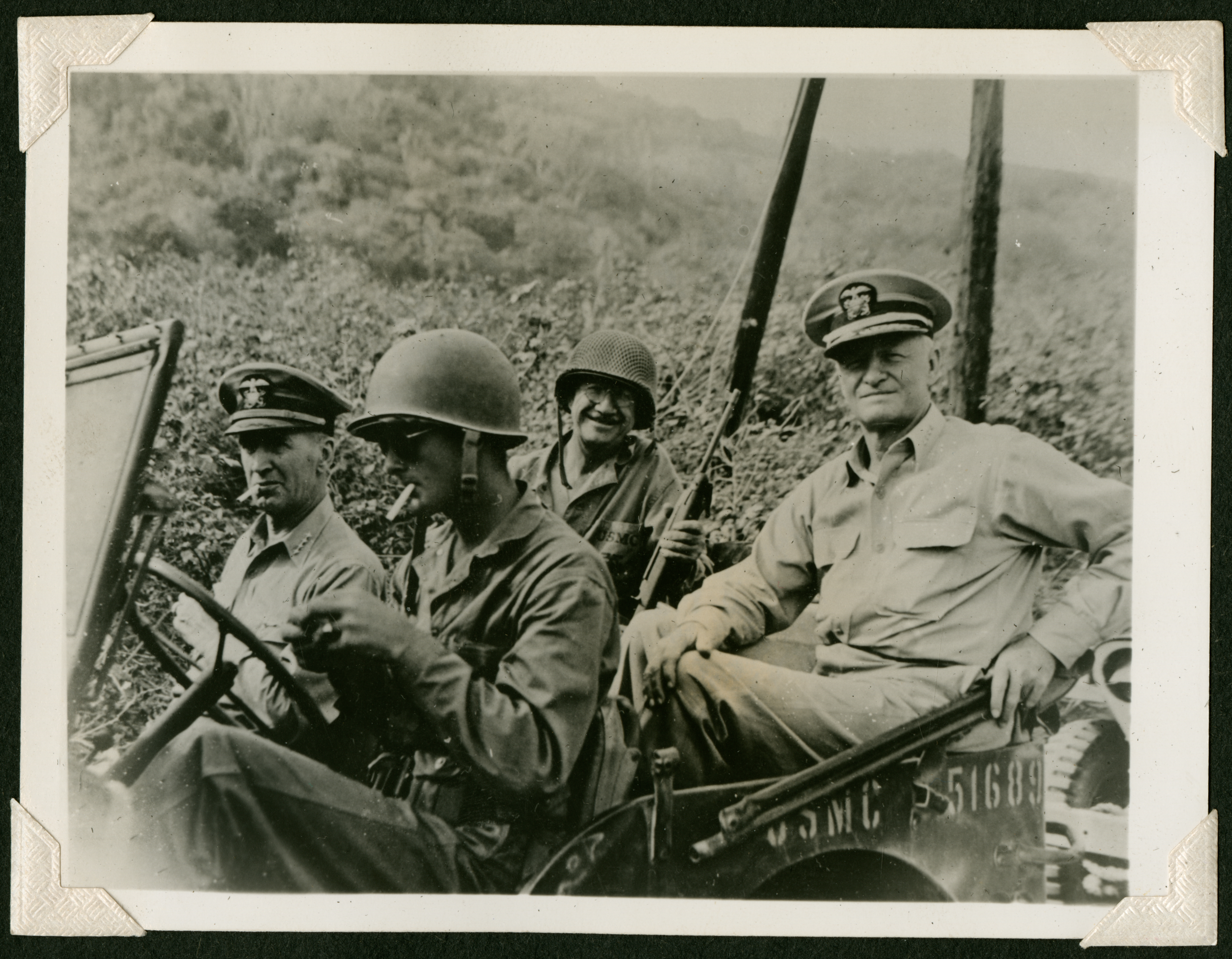 Four soldiers, two of which are wearing naval hats, sitting in an open-top car, with "USMC 51689" written on the side.