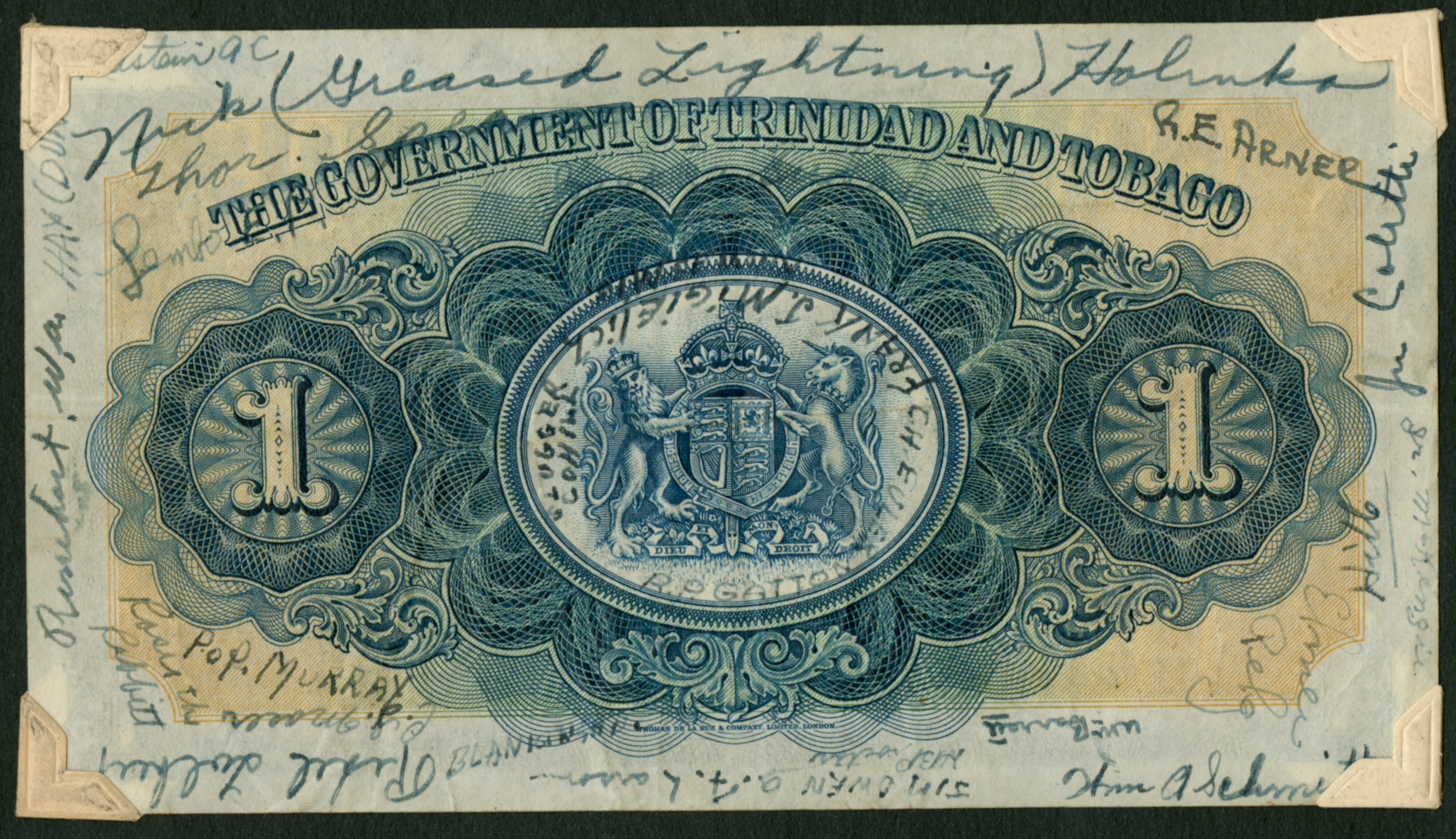 A bill for 1 of the local currency issued by the Government of Trinidad and Tobago. The bill is signed by various people: Goldstein A.C., Nick (Greased Lightning) Holinka, R. E. Arner, Jim Coletti, Hill, Elmer Peg, Him A Schmitt, U M Barrell, Jim Owen , HB Proctor, A. F. Larsom, Blanian AD, Pifel Lolhut, E. Y. Moser, P.O.P. Murray, Rosie the Ribbet, Rinehart, WA, HAY (Duke), Jimbo E. A., Slugger Cohill, Frank J. Migielich, R. O. Gatton, and C. H. Euler