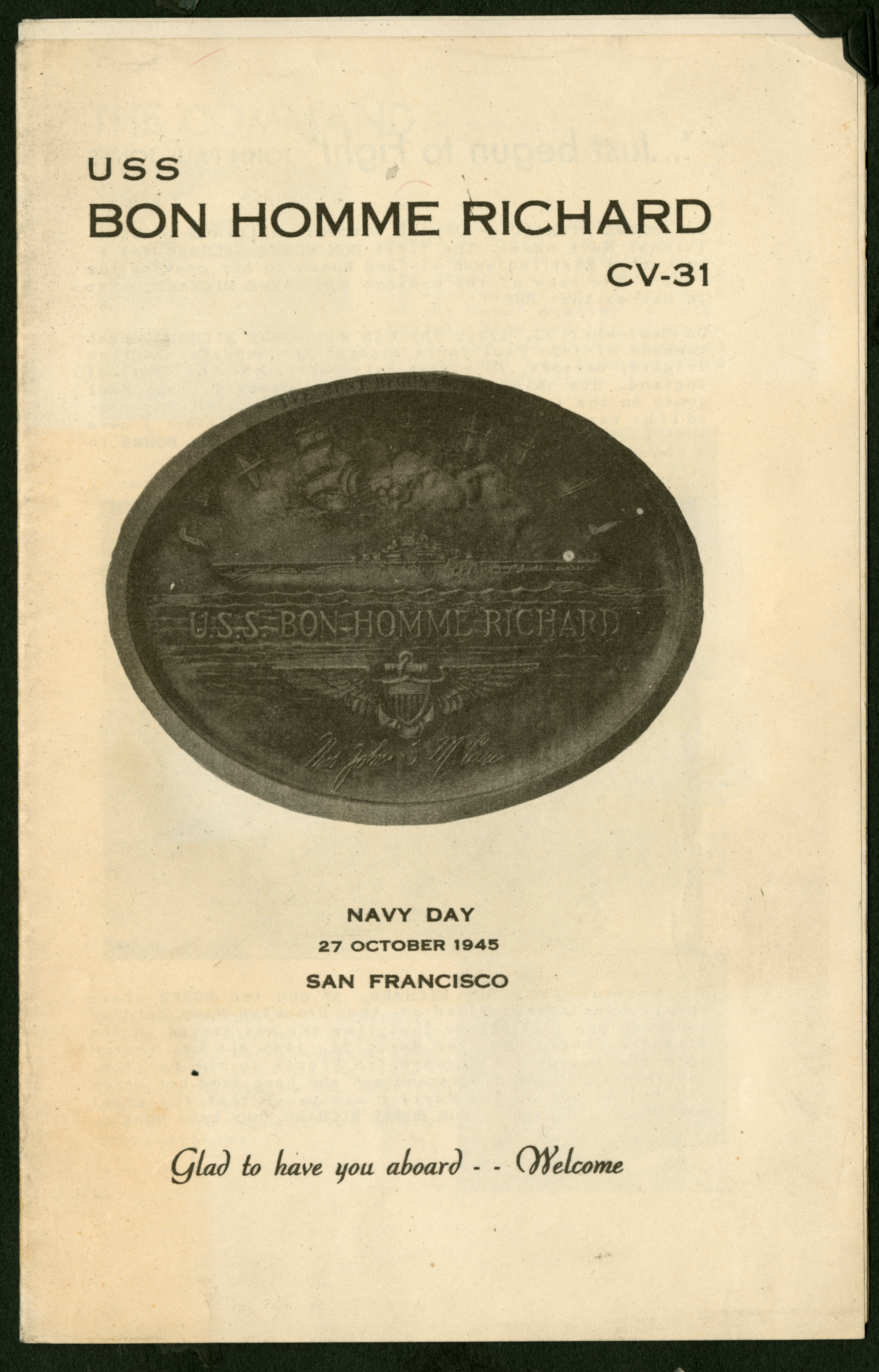 A pamphlet given to service members on the U.S.S. Bon Homme Richard CV-31, printed for Navy Day on the 27 of October 1945 in San Francisco.