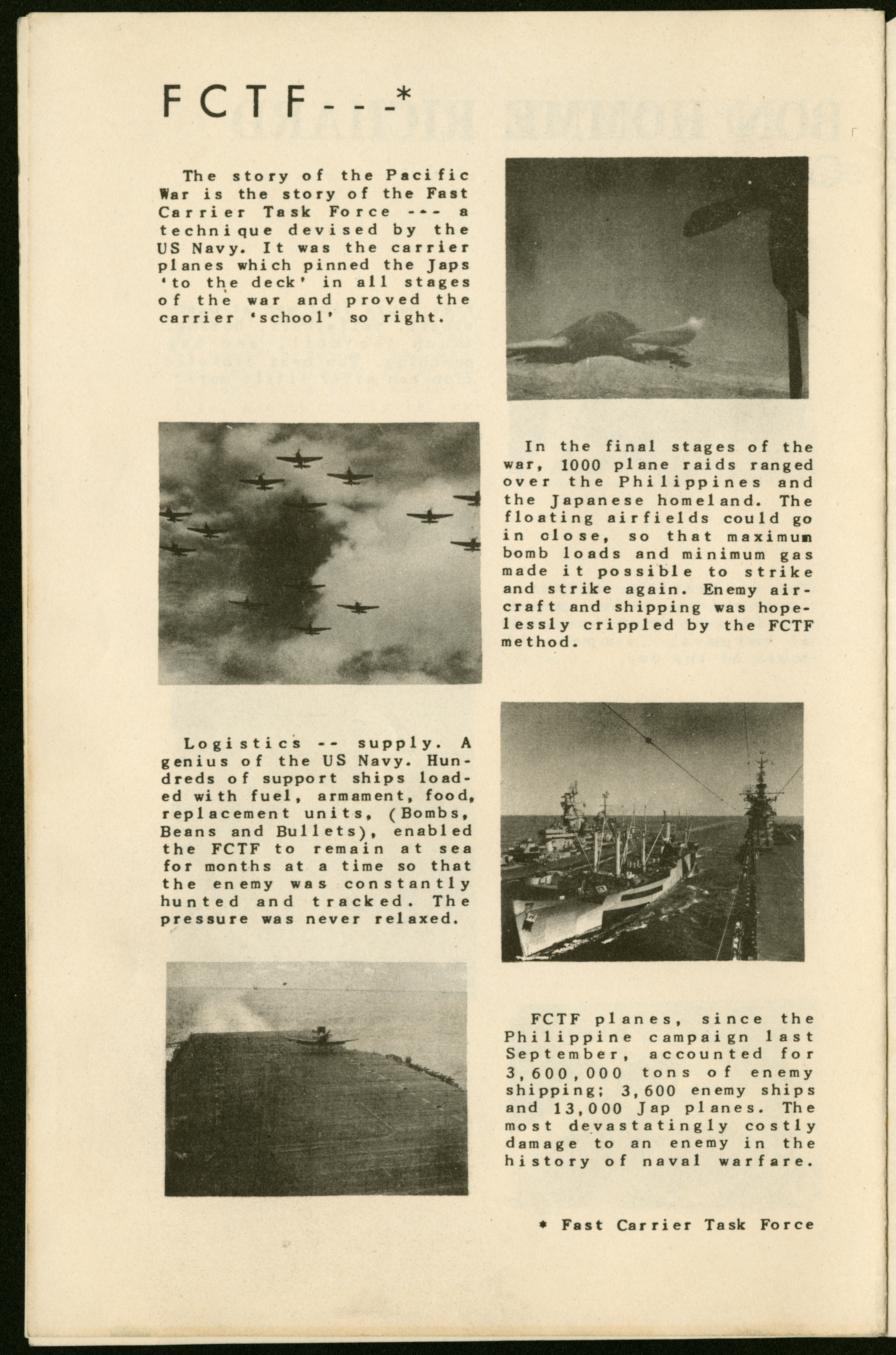 Page 9: Describes the Fast Carrier Task Force and its role in the Pacific theater of the war.