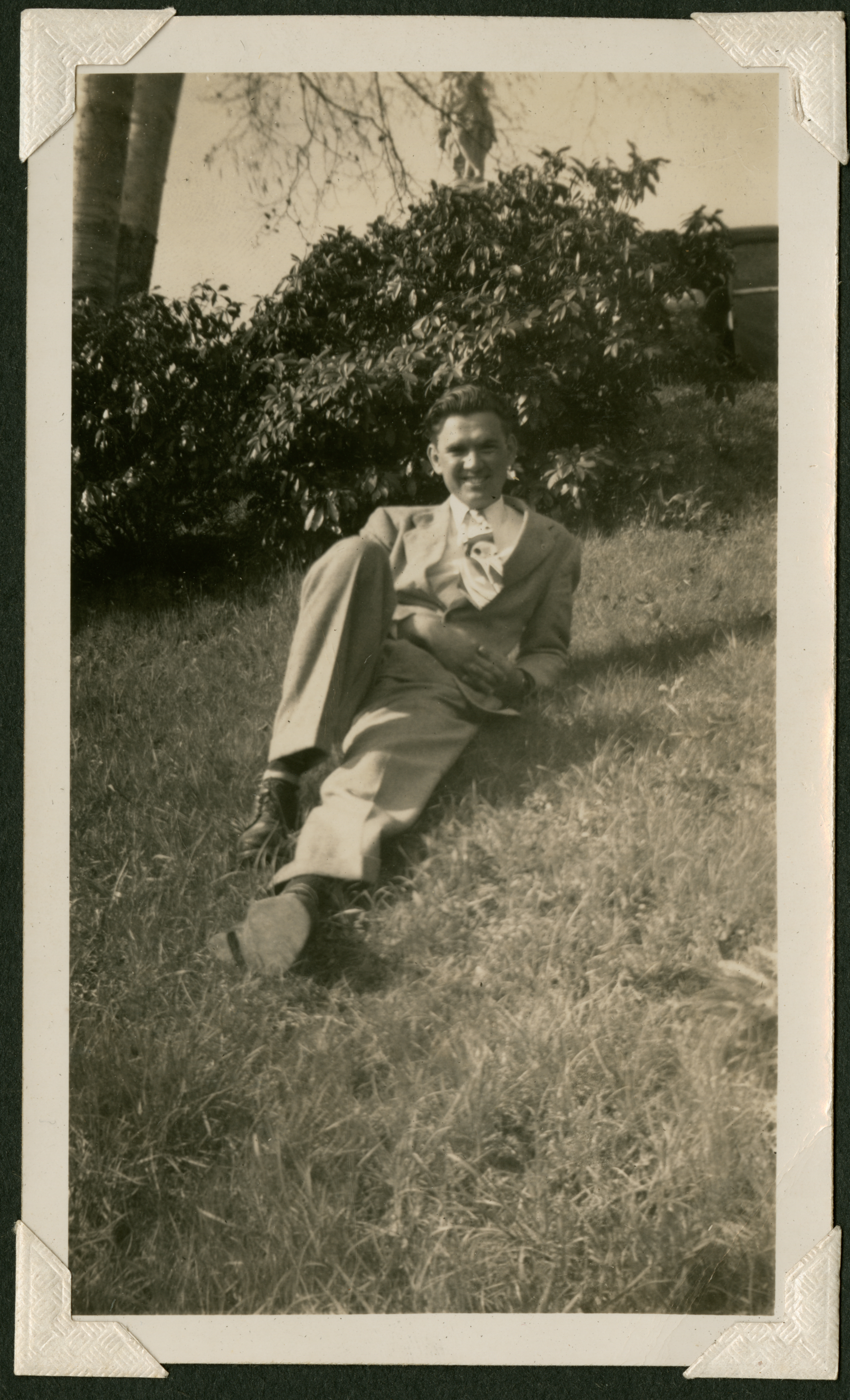 A man, Edmund, in a light-colored suit reclining in he grass in front of a bush. He is smiling at the camera, hands clasped, one leg outstretched and the other with a bent knee. 063 is printed in black ink on the back fo the photograph.