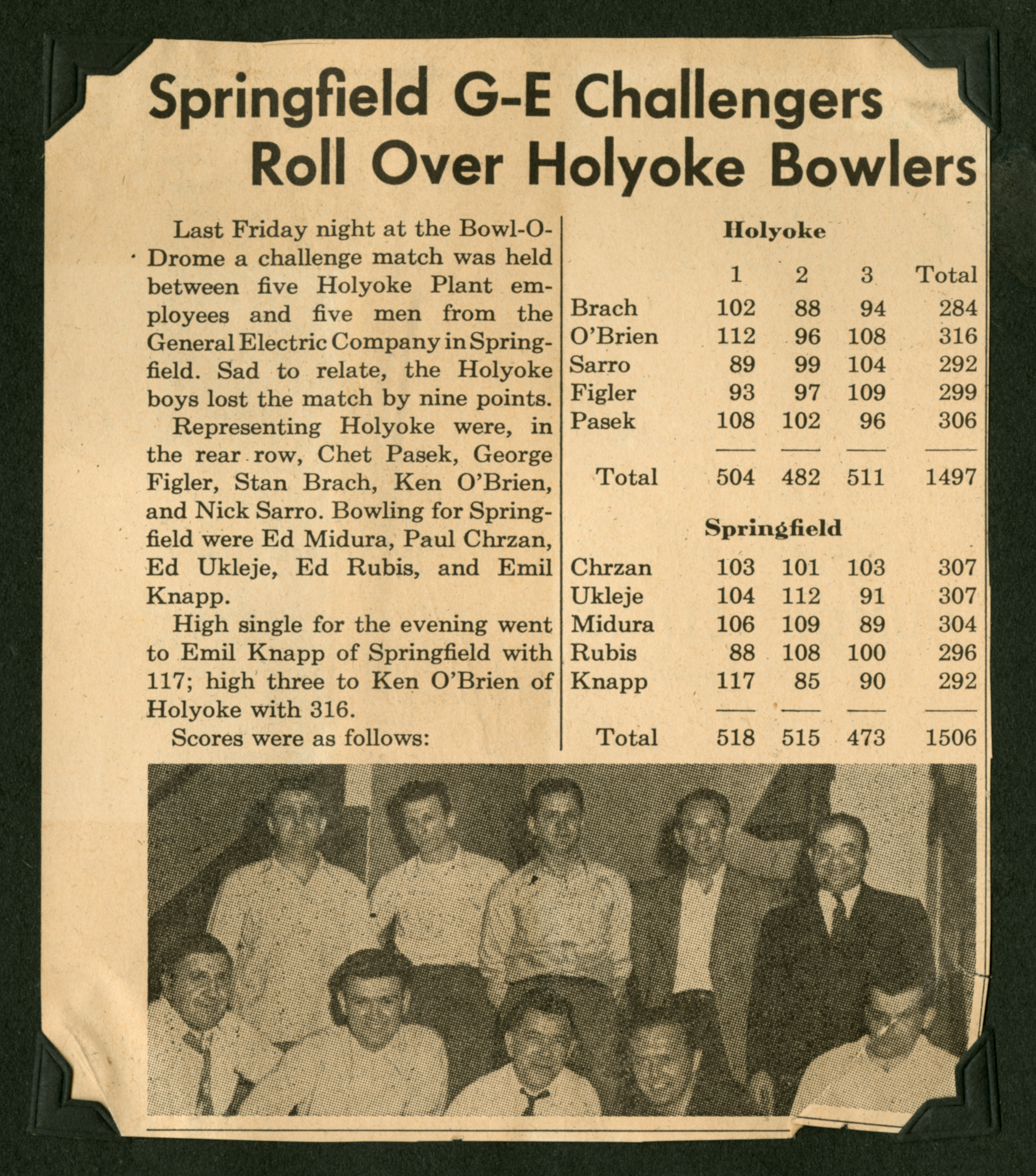 A clipping of a newspaper with two columns of text and a photograph of 10 men sitting/standing in two rows. The headline of this clipping reads, "Springfield G-E Challengers Roll Over Holyoke Bowlers." The text of the column reads, "Last Friday night at Bowl-O-Drome a challenge match was held between five Holyoke Plant employees and five men fromt he General Electric Company in Spring-field. Sad to relate, the Holyoke boys lost the match by nine points./Representing Holyoke were, in the rear row, Chet Pasek, George Figler, Stan Brach, Ken O'Brien, and Nick Sarro. Bowling for Spring-field were Ed Midura, Paul Chrzan, Ed Ukeje [sic], Ed Rubis, and Emil Knapp./High single for the evening went to Emil Knapp of Springfield with 117; high three to Ken O'brien of Holyoke with 316." Then, the scores are listed with Edmund scoring 104, 112, and 91 for a total of 307.